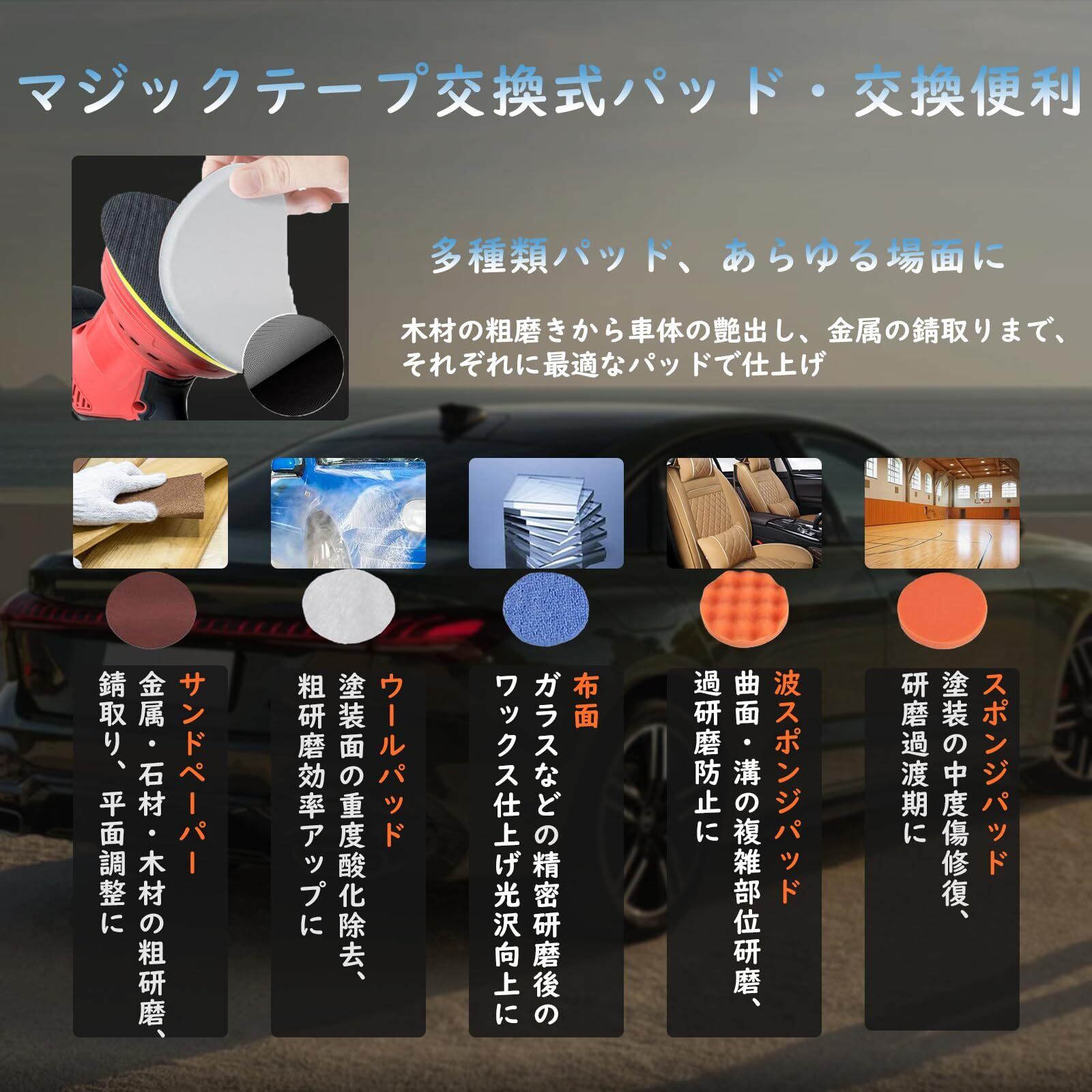 【設計・使いやすさ】 本体重量はわずか1.2kg、片手でも操作可能、長時間作業でも腕の疲れを大幅に軽減。人間工学に基づいた滑り止めハンドルは握り心地に優れ、回転の反動を抑えて安定した操作をサポート。 マジックテープ式の吸着盤(145-150mm 対応)を採用、作業中の効率を向上。初心者はもちろん、女性や高齢者の方でもすぐに使いこなせ、車の隙間やホイール、内装といった細かい部分まで簡単に磨ける使い勝手を実現しています