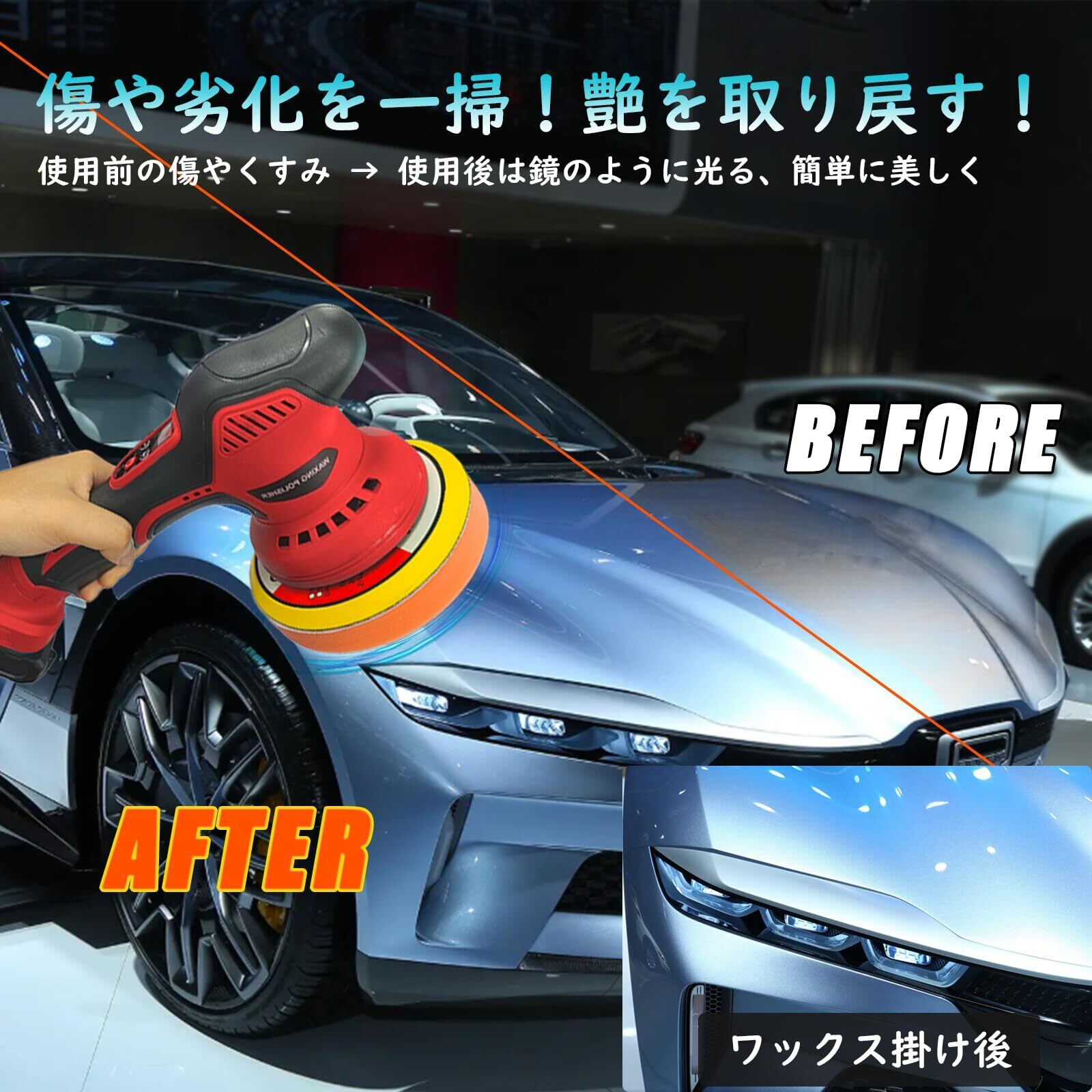 【機能・モーター性能】 高性能純銅モーターを採用し、低騒音(70dB)で高効率な研磨を実現。強力な動力で1分間最大6000回転まで対応し、車体の傷消しや鏡面磨きはもちろん、金属の錆落とし、家具の艶出しまでスムーズに処理。さらに9mm偏心構造のダブルアクション設計を採用、研磨面積が広く均一、塗装面への負担を抑えてムラなく仕上げ。複数の放熱口と過熱防止機能で長時間連続使用も安心、耐久性をさらに高めています