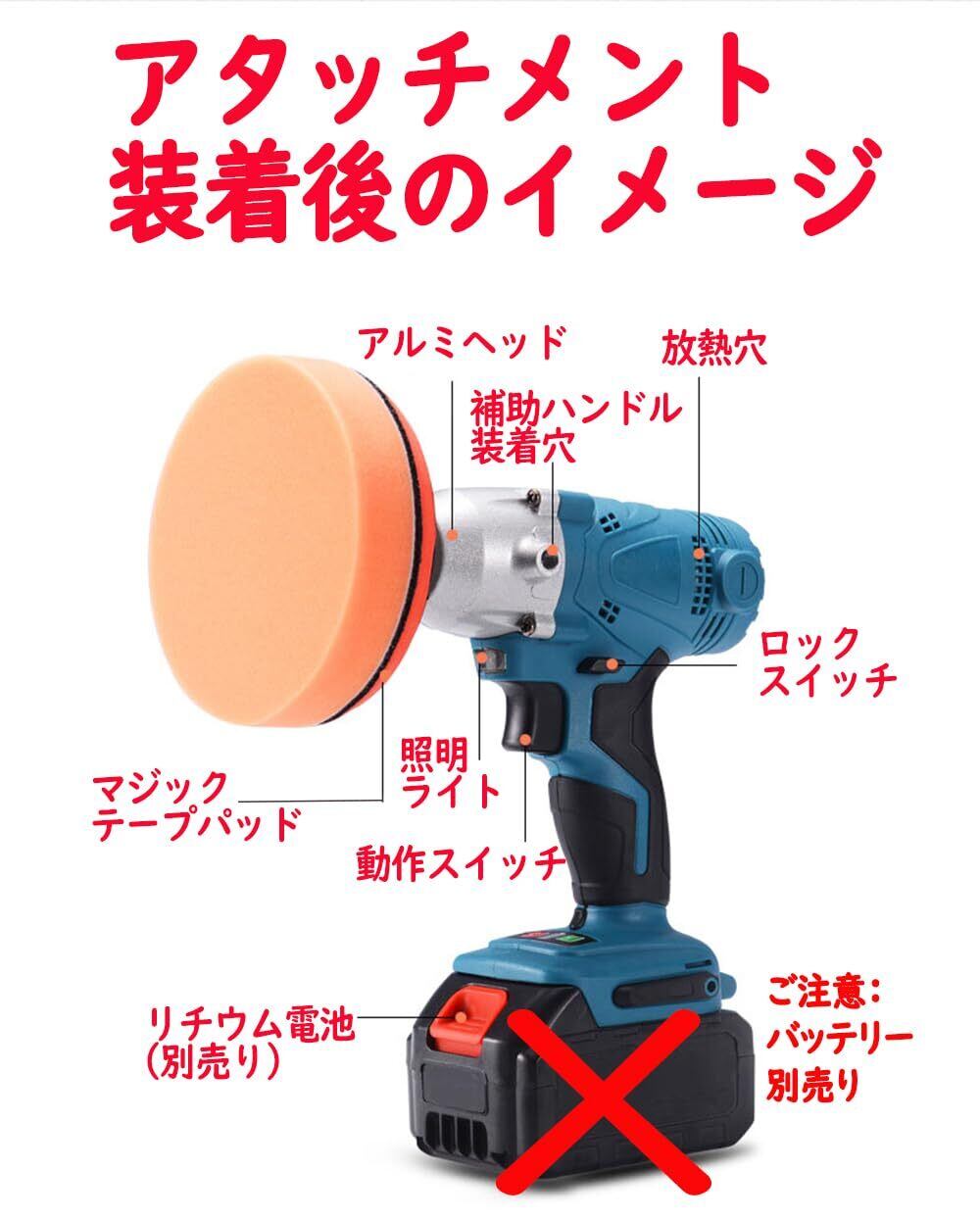 付属コンポーネント ドライバーチャックX1、平型スポンジパッドX1、波型スポンジパッドX1、サンディングペーパーX1、マジックテープパッドX1、取付ネジX1、補助ハンドルX1、レンチX1、羊毛仕上げバフX1