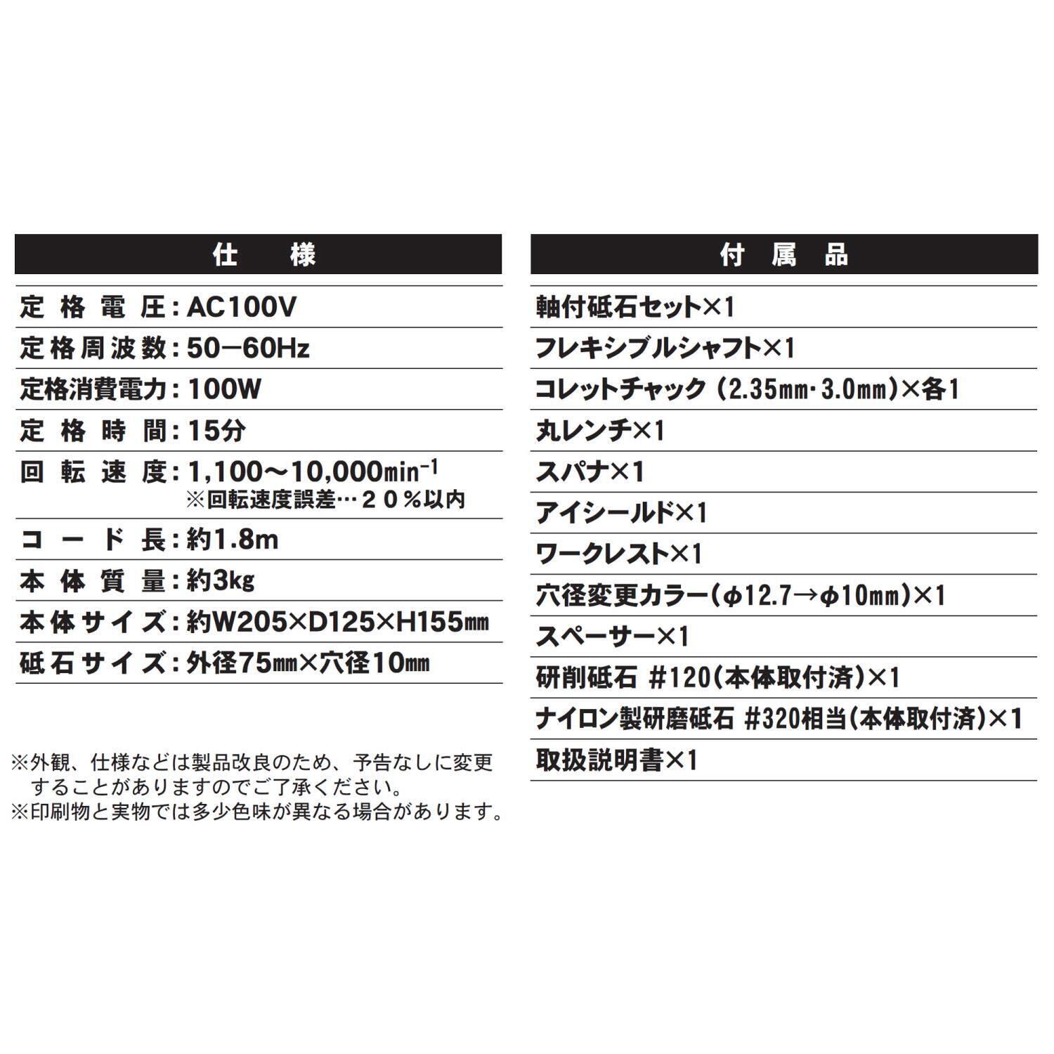 付属品:軸付砥石セット、フレキスブルシャフト、コレットチャック(2.35mm・3.0mm)、丸レンチ、スパナ、アイシールド、ワークレスト、穴径変更カラー(φ12.7→φ10mm)、スペーサー、研削砥石(#120)、ナイロン製研磨砥石(#320相当)
