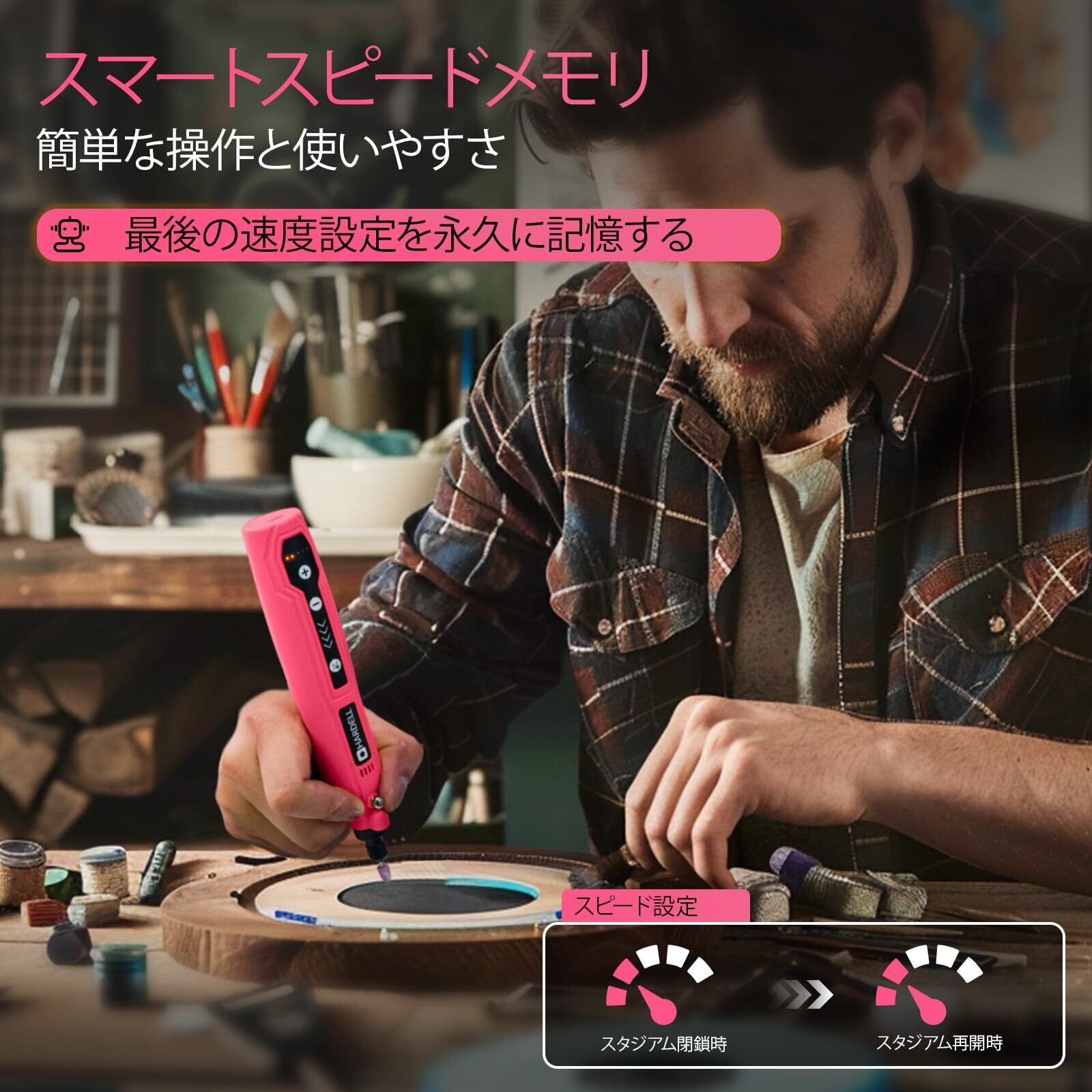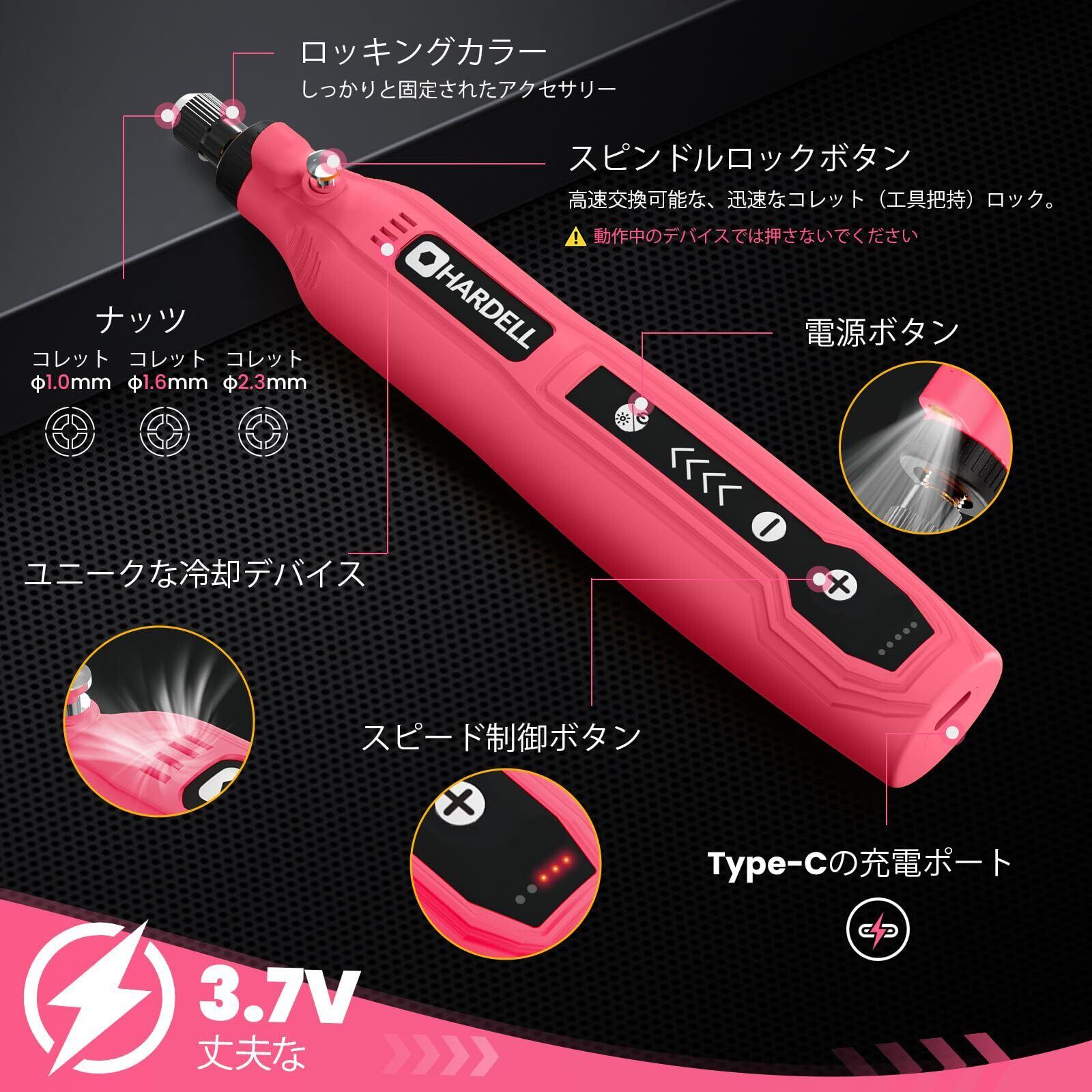 【人気商品】HARDELLミニルーター 5段変速 61PCS 18000RPM高速回転 USB充電式ミニ工具セット ルーターツール 電動 軽作業に適した 無線研磨/ポリッシュ/穴あけ/切断/除錆/彫刻/DIY/ネイルスタジオ 照明付き充電式ルーター 日本語取扱い説明書(ピンク)