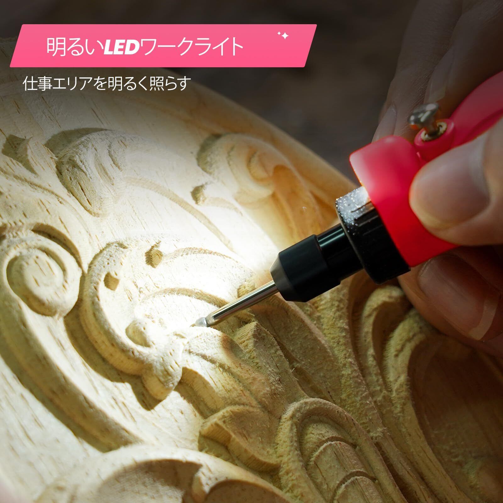 【LED指示灯付きの回転ドリル】コンパクトな充電式回転工具はペンのサイズで、片手で簡単に操作することができます。グリップの取りやすいハンドルがあり、長時間使用しても疲れにくくなっています。コンパクトなボディなので、細部の彫刻や研磨に特に適しています。また、手作り工芸品やアクセサリーの制作にも利用することができます。LED照明が付いているため、夜間や暗い場所でも作業をはっきりと行うことができます。