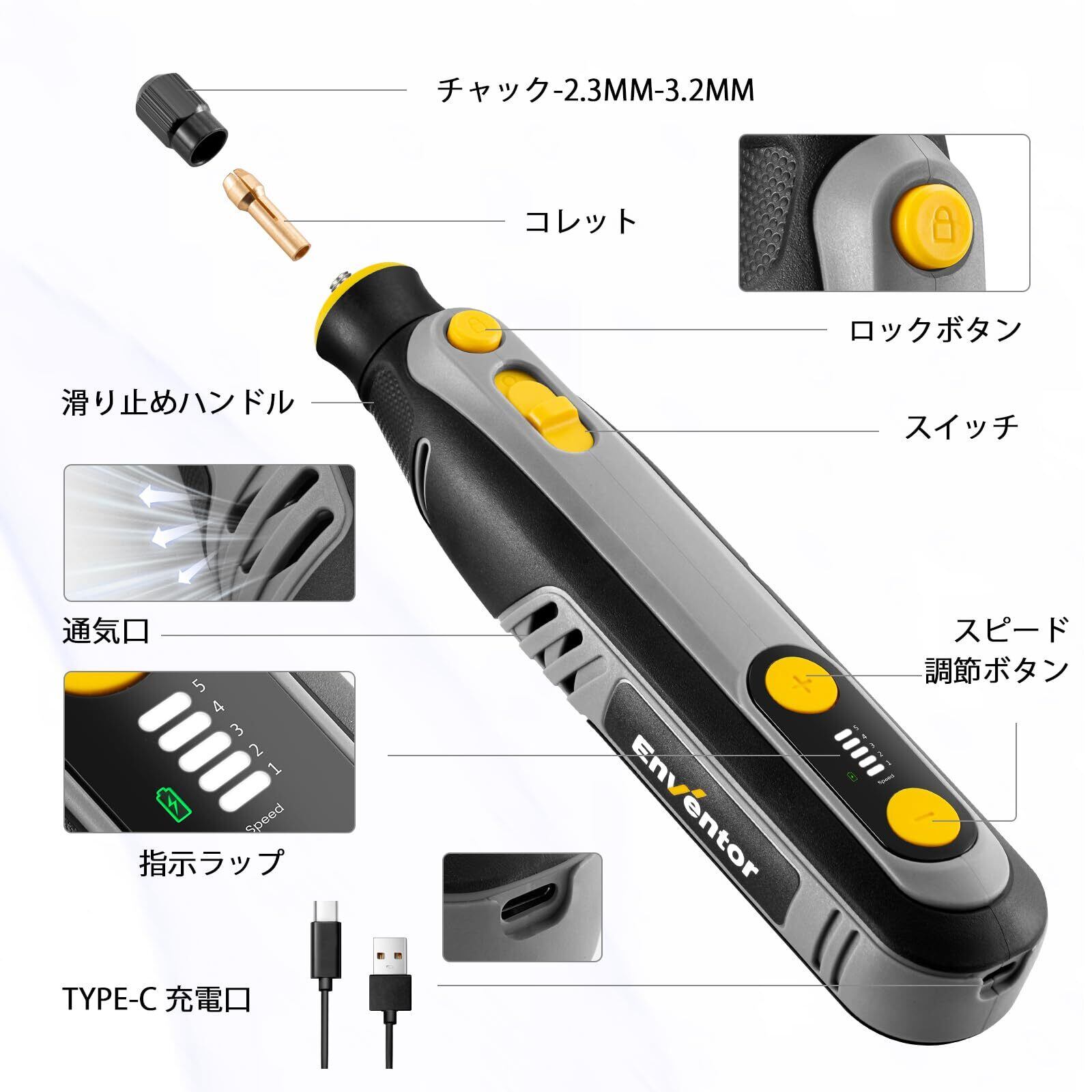 Enventor 8V ペン型ミニルーター ワイヤレス ミニルーター リューター DIY工具セット 5段変速 小型 軽量 5000&30000RPM 過負荷保護 DIY 切断 電動 高速回転 彫刻ペン 彫刻 フライス 研削 研磨 除去 穴あけ USBType-C充電 コンパクト 木工 彫刻 ドリル 汚れ落とし つや出し