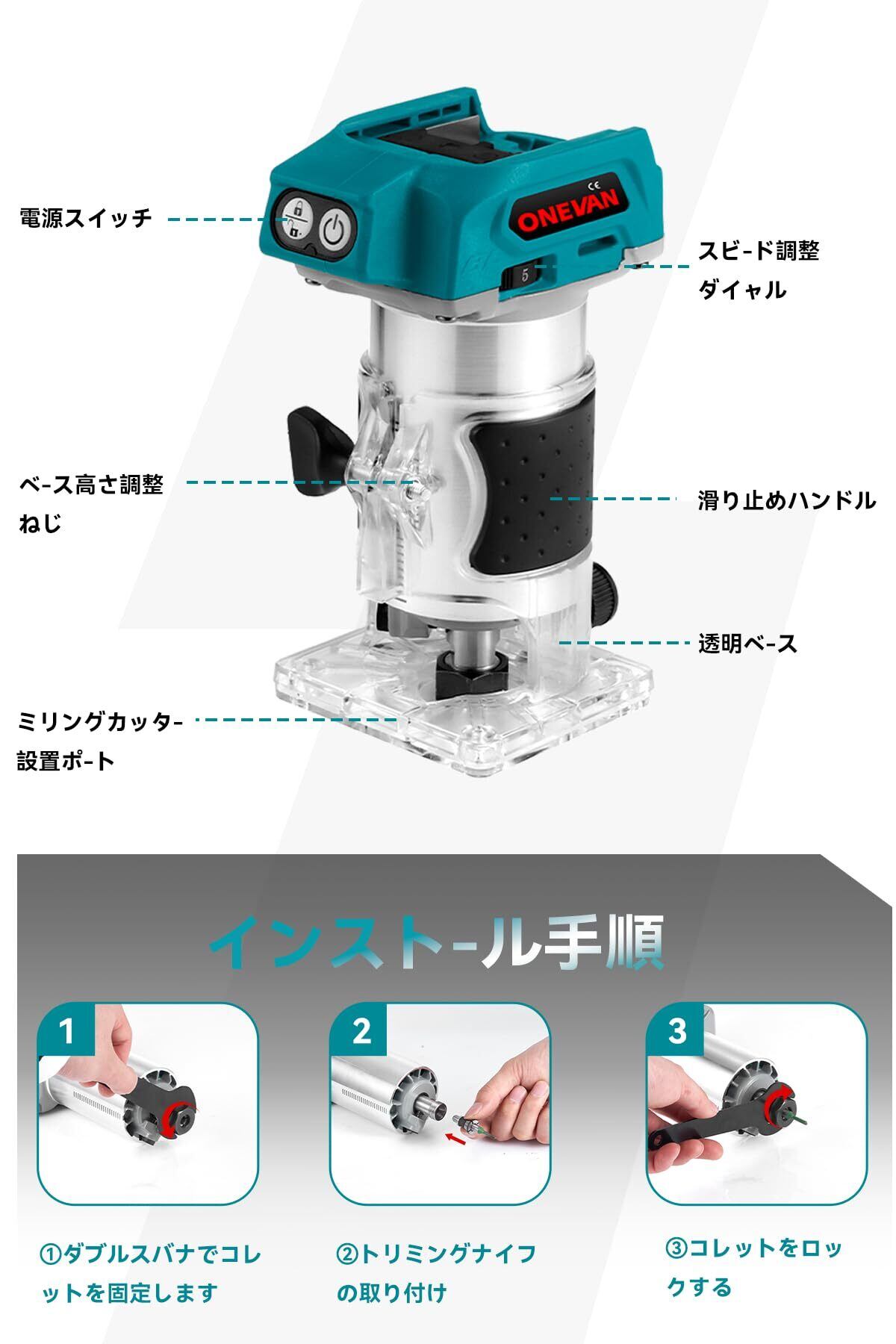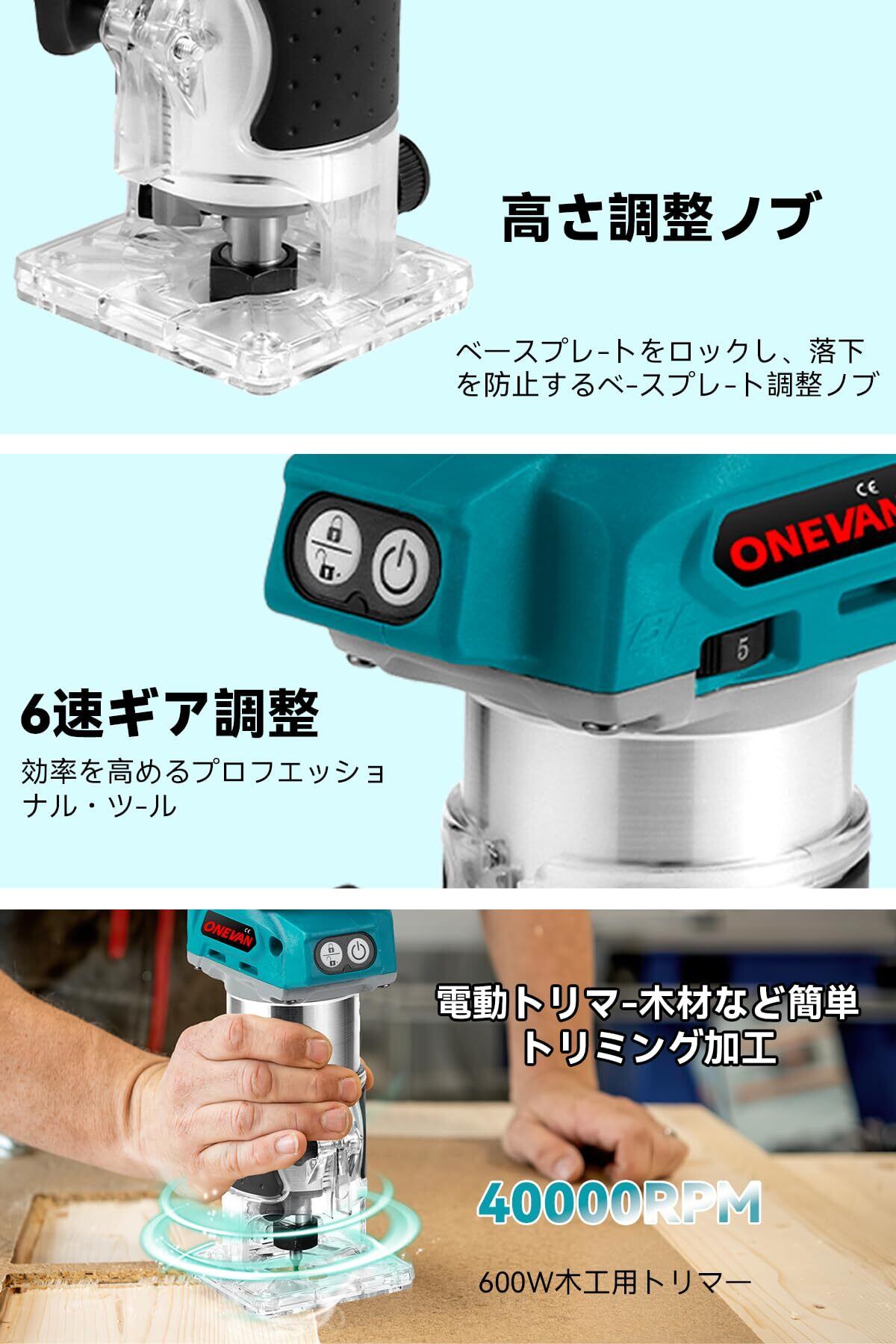 【使いやすさ&多彩な用途】人間工学に基づいたグリップデザインで手にしっかりフィットし、長時間作業でも疲れにくい。透明ベースで視認性が高く、初心者でも正確なトリミングが可能。付属のトリミングガイドや細かい調整ノブにより、溝切り・面取り・装飾加工・円形加工など、多彩な加工をサポート。マキタ トリマーやトリマー マキタをお探しの方に、木工DIYから本格的なプロ作業まで幅広く対応する一台です。