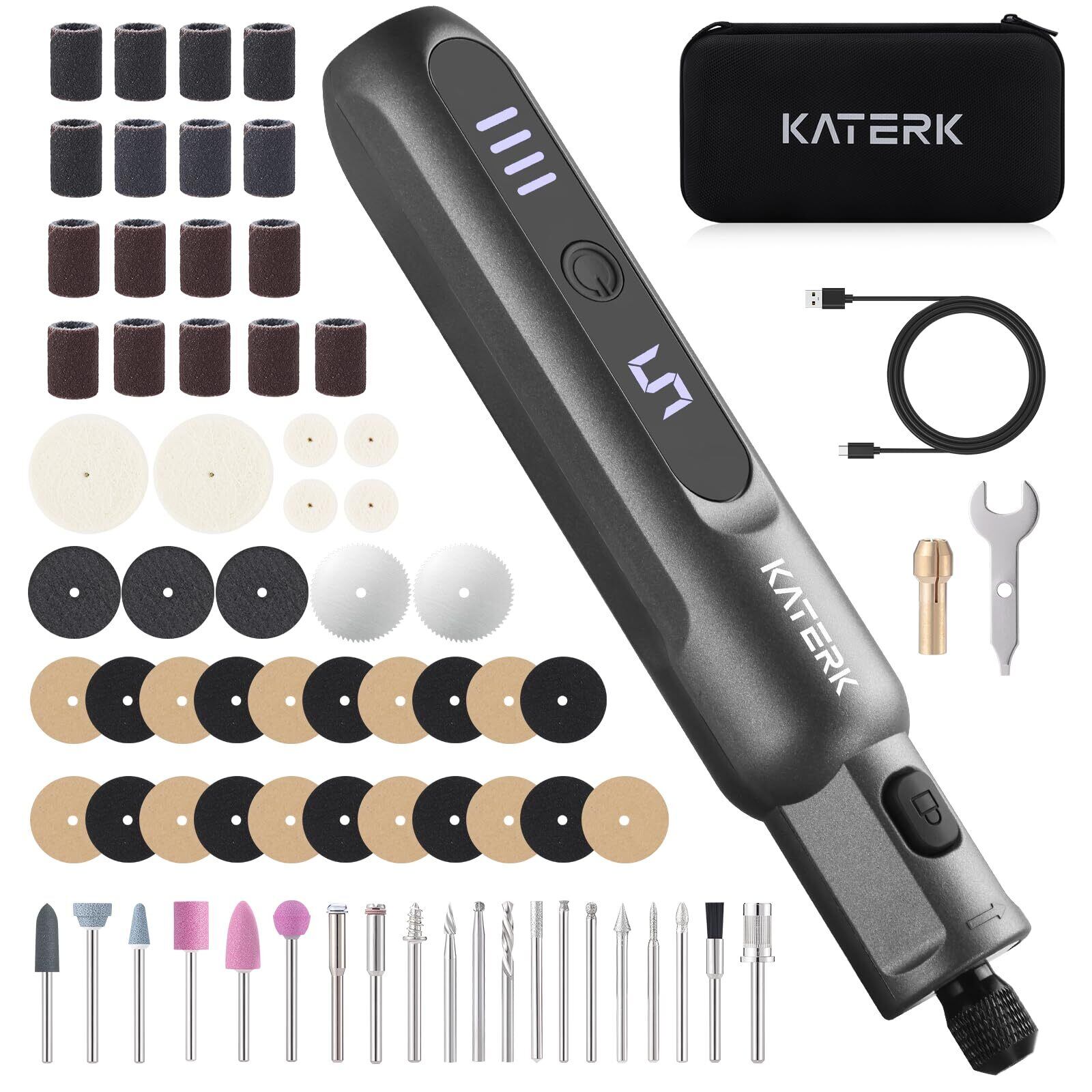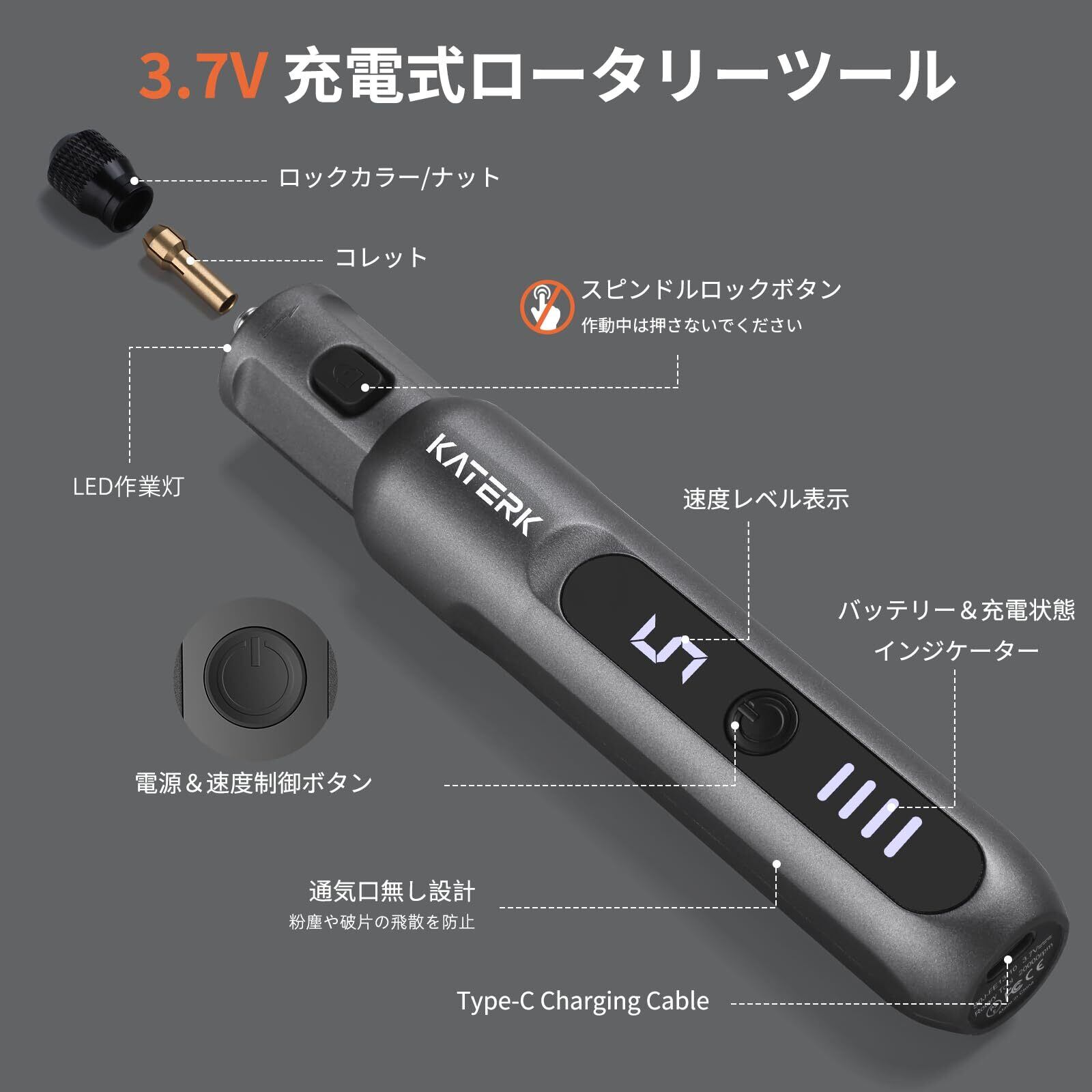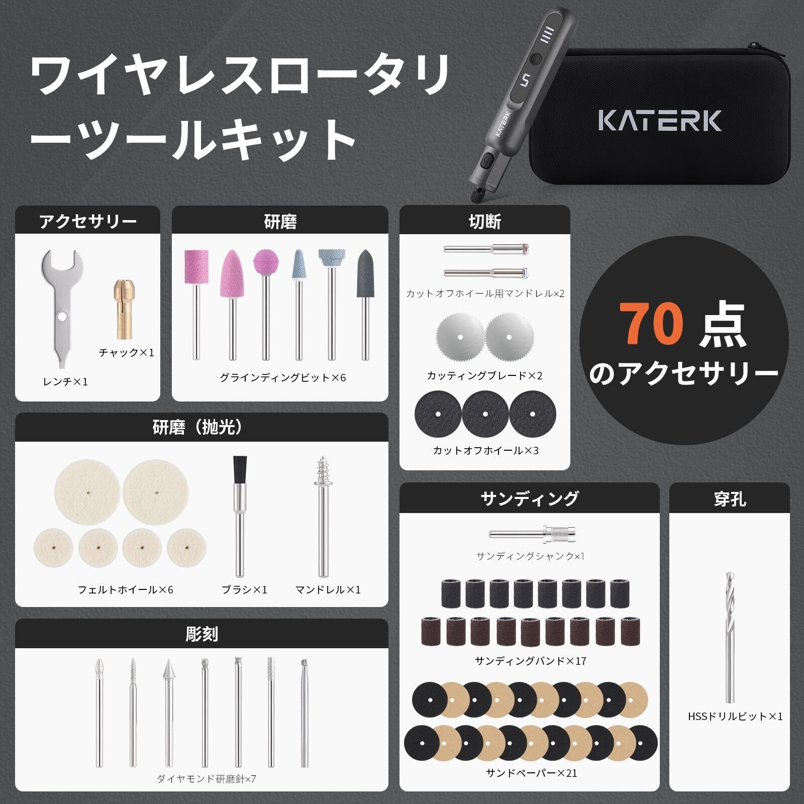 Katerkミニルーター 20000RPM/min 5段変速 電動リューター コードレス コンパクト充電式 リューター コンパクトルーター 70点アクセサリーセット付き 木工/研磨/彫刻/切削/穴あけ/汚れ落とし/錆落とし/切断/つや出し/DIY軽作業
