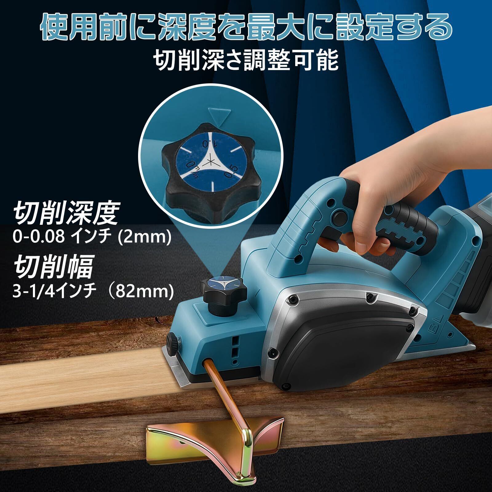 電動カンナ 充電式かんな 【マキタ 互換品】 ブラシレスモーター 【750W高出力 15000RPM 切削幅82mm 0-2mm切削深さ調整可能】 V溝設計 充電式カンナ 電動かんな マキタ 18Vバッテリー対応 コードレス 振動低減 低騒音 小型 安全スイッチ付き 人間工学ハンドル付き 平面削り/相じゃくり/面取り加工 木工工具 日本語取扱説明書 【本体のみ バッテリー別売り】