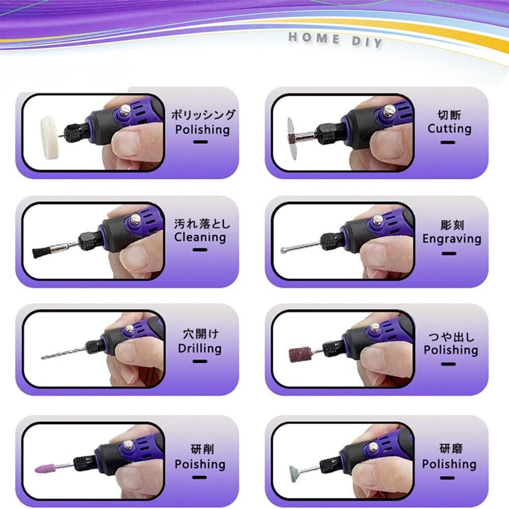 【85個アクセサリー&専用収納ケース】多様な85種類のルーター 工具アクセサリーで、様々なプロジェクトを効果的に完了し、より多くの作業可能性を提供することができます。研磨、穴あけ、切断、研削、ドリル、クリーニング、彫刻などに非常に適しています。これらのアクセサリーは、他のブランドのグラインダーツールとも互換性があります。アクセサリーのより便利な収納のための頑丈な専用ケースで、耐落下性、防湿性、携帯性があります。