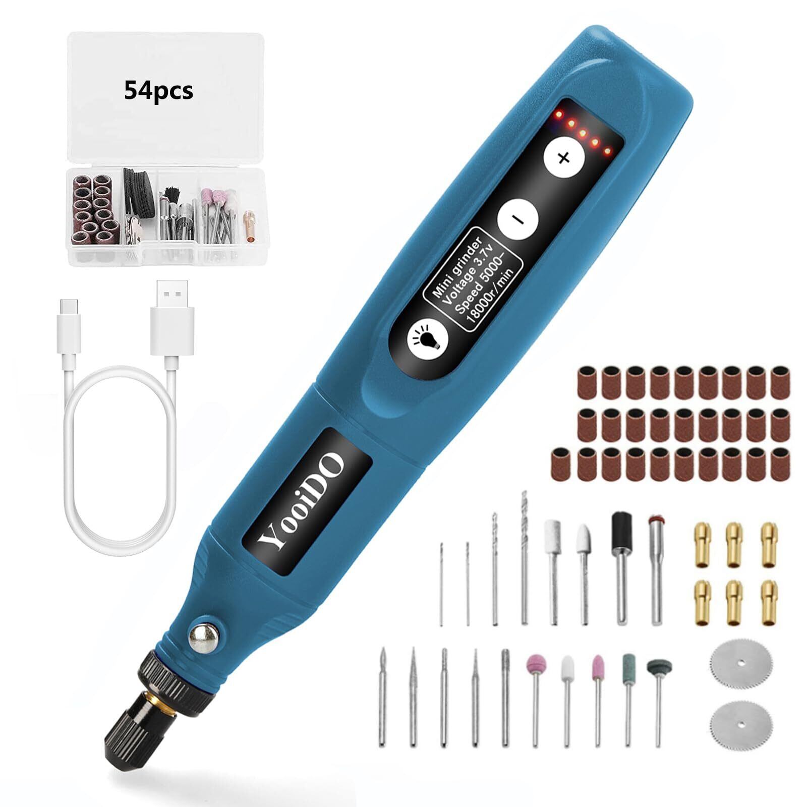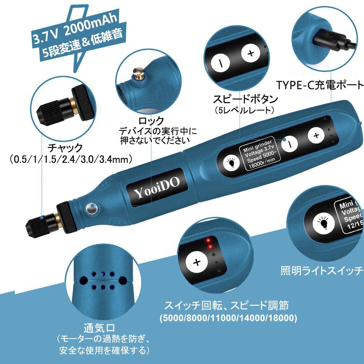 【限定セール】ミニルーター リューター コンパクトルーター 5段変速 54PCSセットYooiDOルーター工具 2000mAhリューター 電動 18000RPM高速回転 USB充電式 コードレス 研磨/彫刻/切削/穴あけ/汚れ落とし/錆落とし/切断/つや出し/ネイルアート DIY軽作業 電動ルーター 充電式りゅーたー 照明ライト付き プレゼント 父親 男性 ギフト 日本語取扱い説明書(ネイビー)