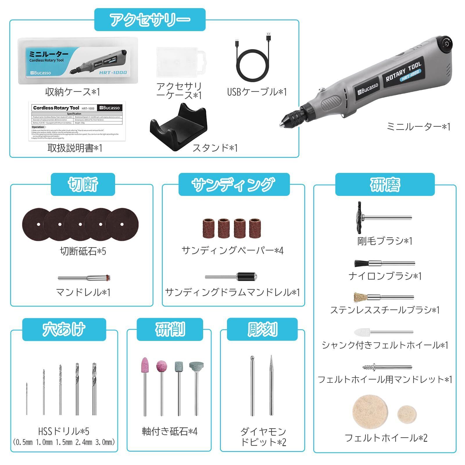 【2025最新】ミニルーター 2.0 ユニバーサルチャック 軸径0.5-3.2mm対応 リューター 無段階調速 充電式 コードレス 木工/彫刻/穴あけ/研磨/切断/つや出し HRT-1000