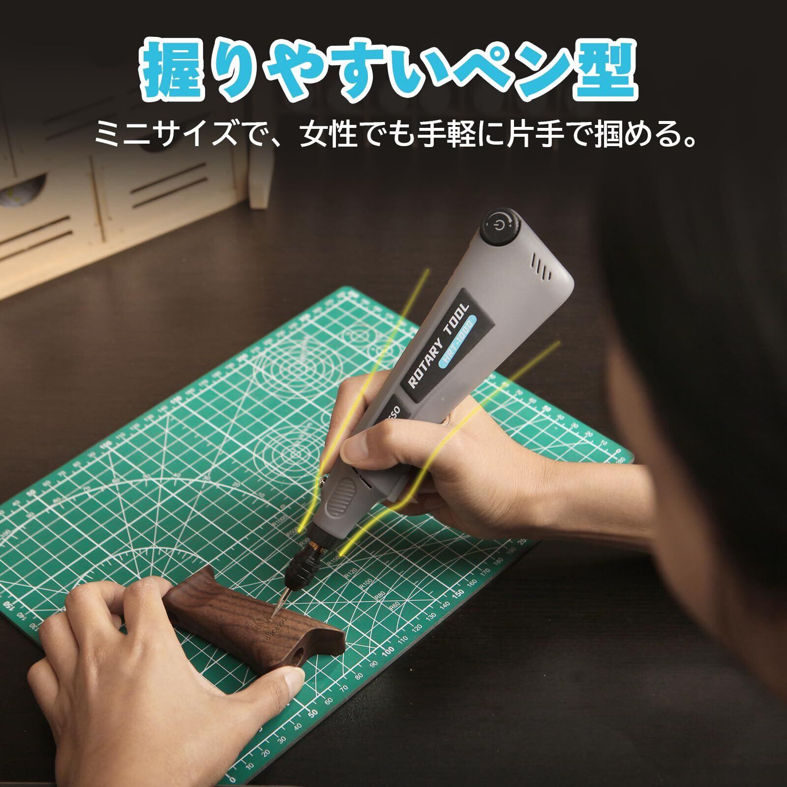 【人間工学設計】このリューターは人間工学に基づき、細身で持ちやすいように設計されており、長時間持っていても手が疲れにくい、細かい動きや不便なところでも処理ができる優れものです。片手サイズのコンパクトなサイズで、どこにでも持ち運ぶことができます。