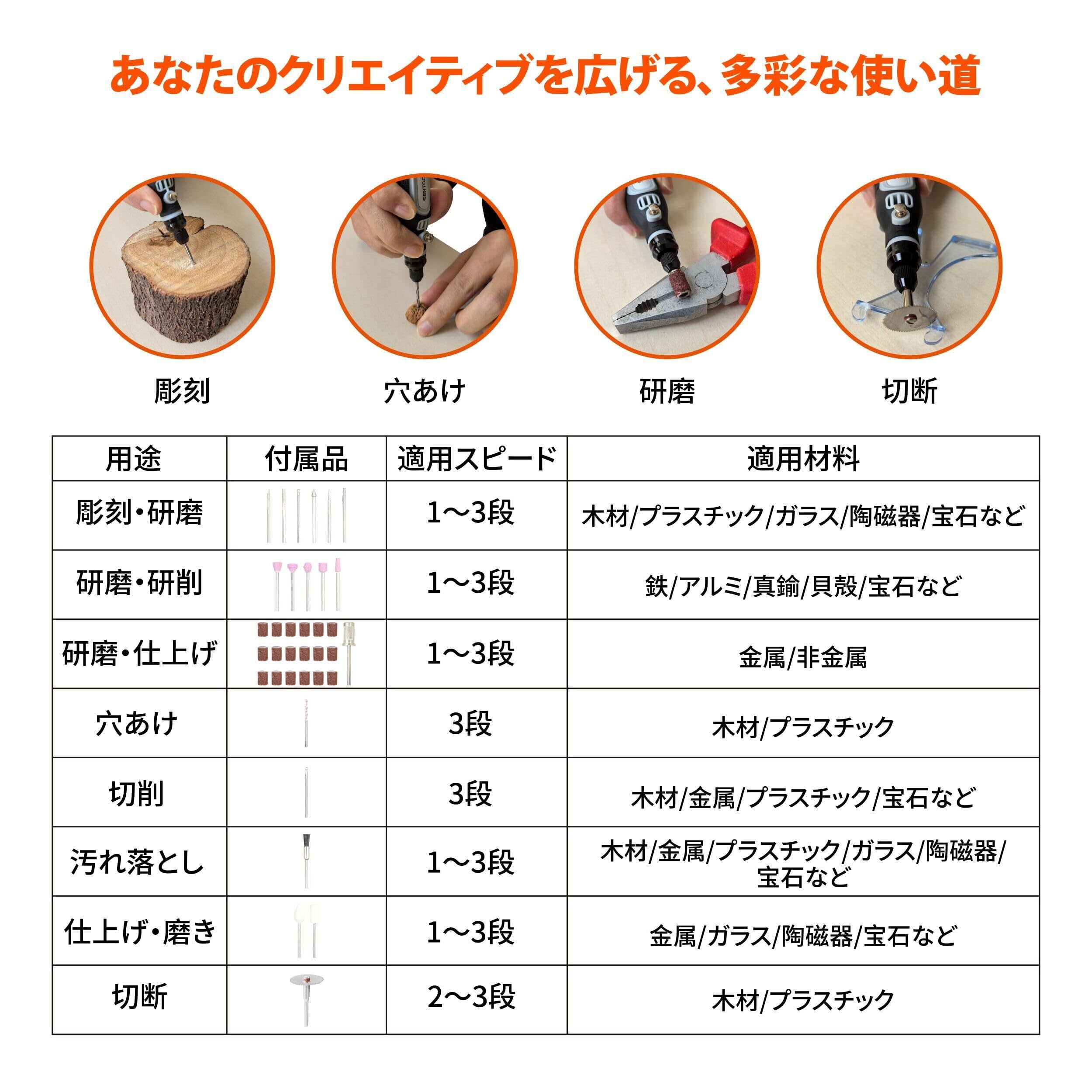 【充実の40点セット】砥石、カッティングディスク、研磨ヘッドなど、多様な作業に対応する40種類の付属品が初めから全て揃っています。別途アクセサリーを購入する必要がなく、届いたその日からすぐに作業を始められます。