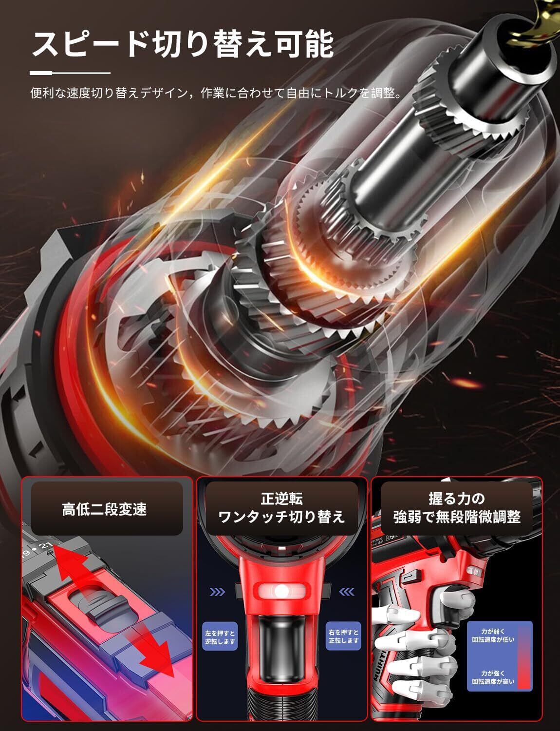 【42N·mの強力トルク&25段階調整】最大トルク42N·mと25段階のトルク調整機能を備え、回転速度は2段階(0~350RPM / 0~1650RPM)の切り替えが可能で、トリガーの押し込み具合による無段階微調整も対応しており、木材、金属、プラスチックなど多様な素材に合わせてトルクと速度を最適化し、素材を傷つけず効率的で正確な作業を実現します。