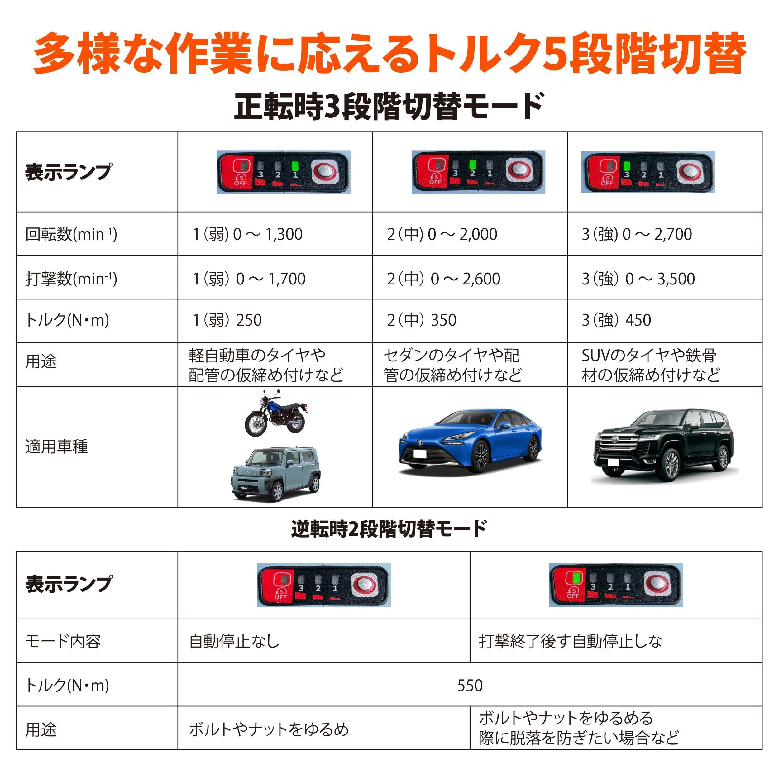 「多様な作業に応えるトルク3段切替」1(弱モード):軽自動車のタイヤや配管の仮締め付けなど。2(中モード):セダンのタイヤや配管の仮締め付けなど。3(強モード):SUVのタイヤや鉄骨材の仮締め付けなど。無段変速スイッチで回転数を自在に調整!トリガースイッチの押し込み量に連動して、回転数と打撃力を無段階でコントロール可能。回転数(min-1):1(弱)0~1,300、2(中)0~2,000、3(強)0~2,700。打撃数(min-1):1(弱)0~1,700、2(中)0~2,600、3(強)0~3,500。角ドライブ 12.7mm。