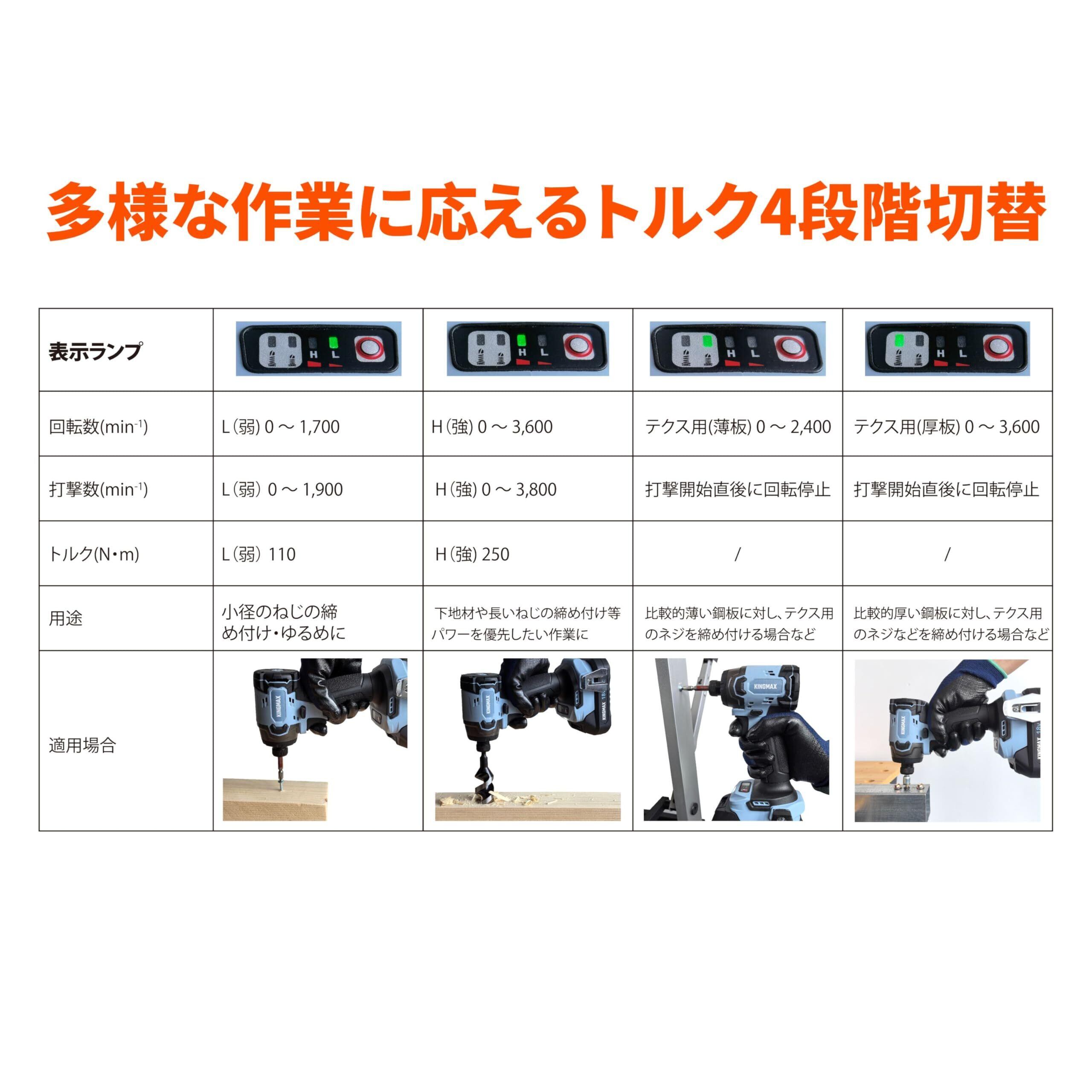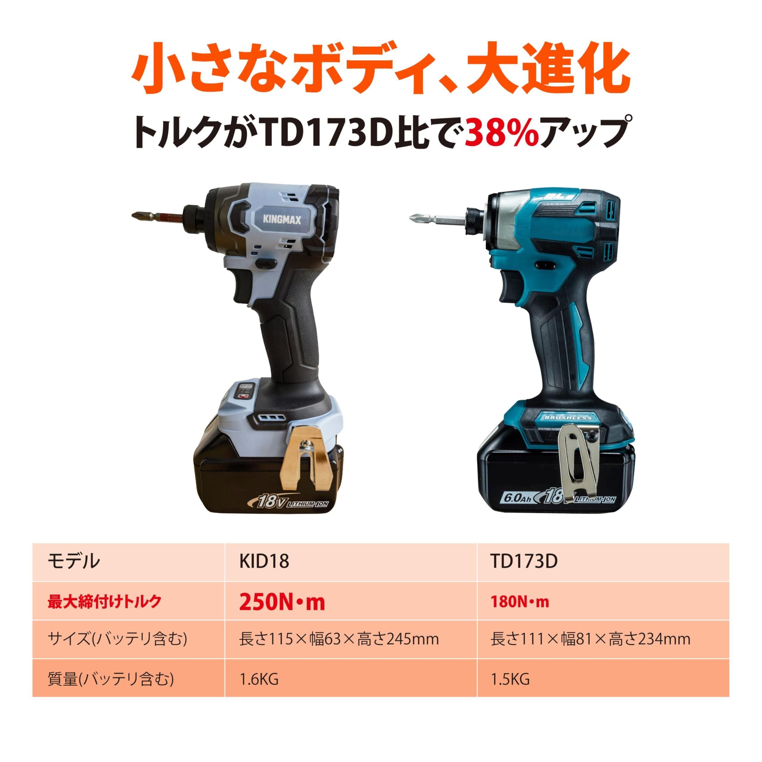 KINGMAX インパクトドライバー マキタ 互換 工具 18v充電式 インパクト 最大トルク250N・m 日本国内付 4段階切替モード 高出力ブラシレスモーター LED残照機能付き KID18 (本体のみ)