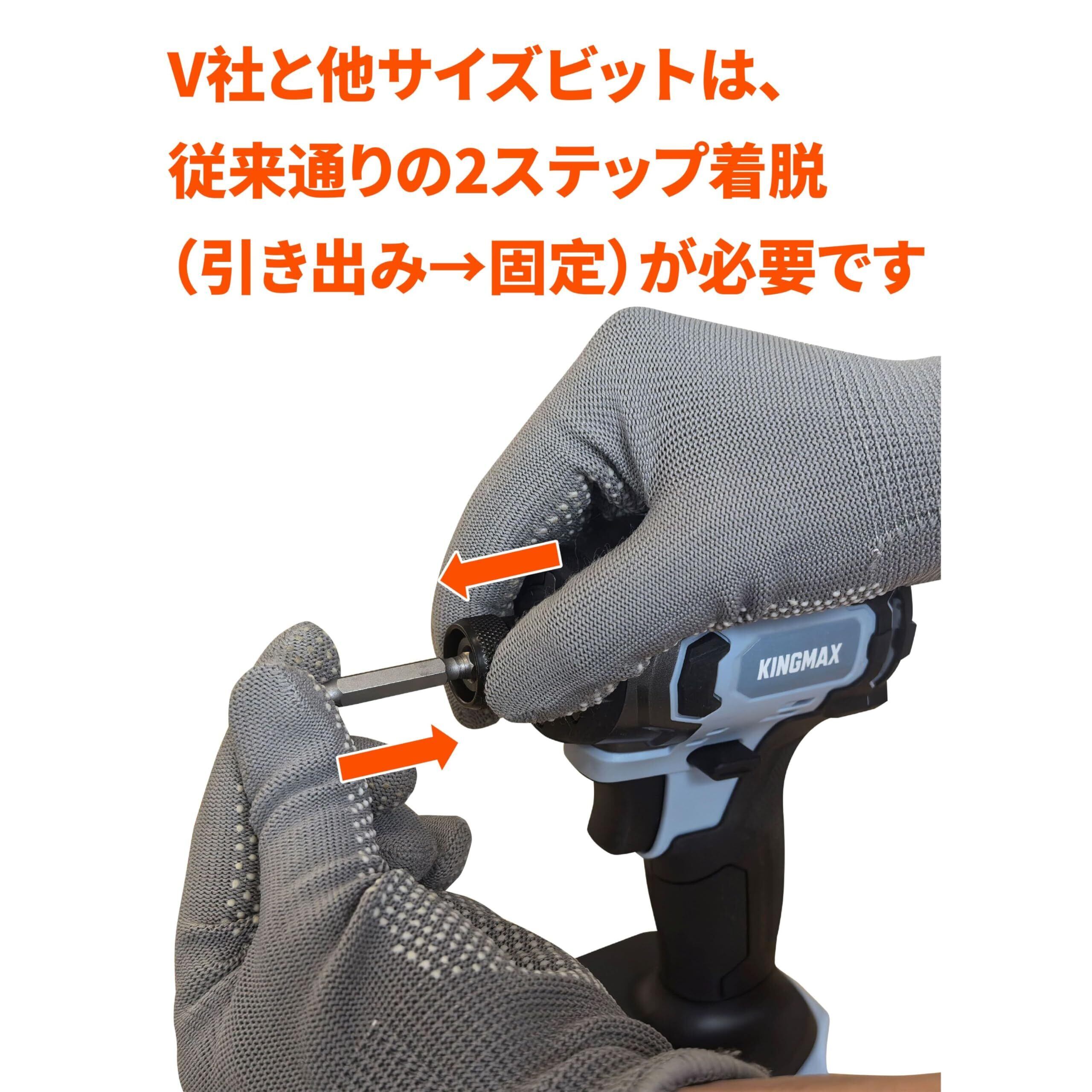 「ワンタッチ式ビット取付けシステム」ワンタッチチャック採用で、ビットを0.5秒で取付け可能。※付属の標準ビットと同サイズのビットに限り、片手0.5秒で取付け可能。他サイズビットは、従来通りの2ステップ着脱(引き込み→固定)が必要です。