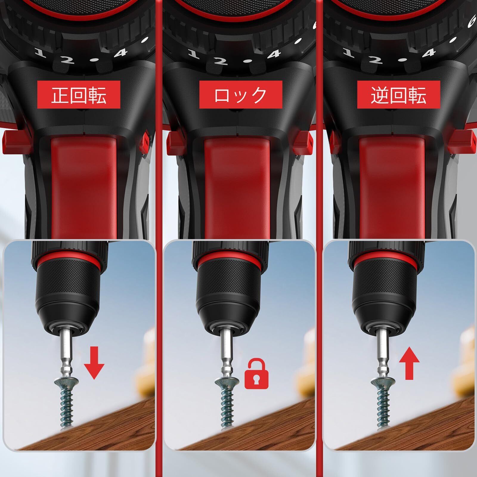 【LEDライト&正逆転切替】当社の電動ドリル/振動ドリルドライバーは、作業時に自動点灯する先端LEDライトを搭載しており、暗い場所でも作業部を明るく照らします。ワンタッチで切り替え可能な正逆転機能で、ネジの締め付けから緩めまでスムーズに対応。さらに安全性を考慮し、正逆転切替レバーを中央位置に設定するとスイッチがロックされ、振動ドリル使用時の誤作動を防止します。