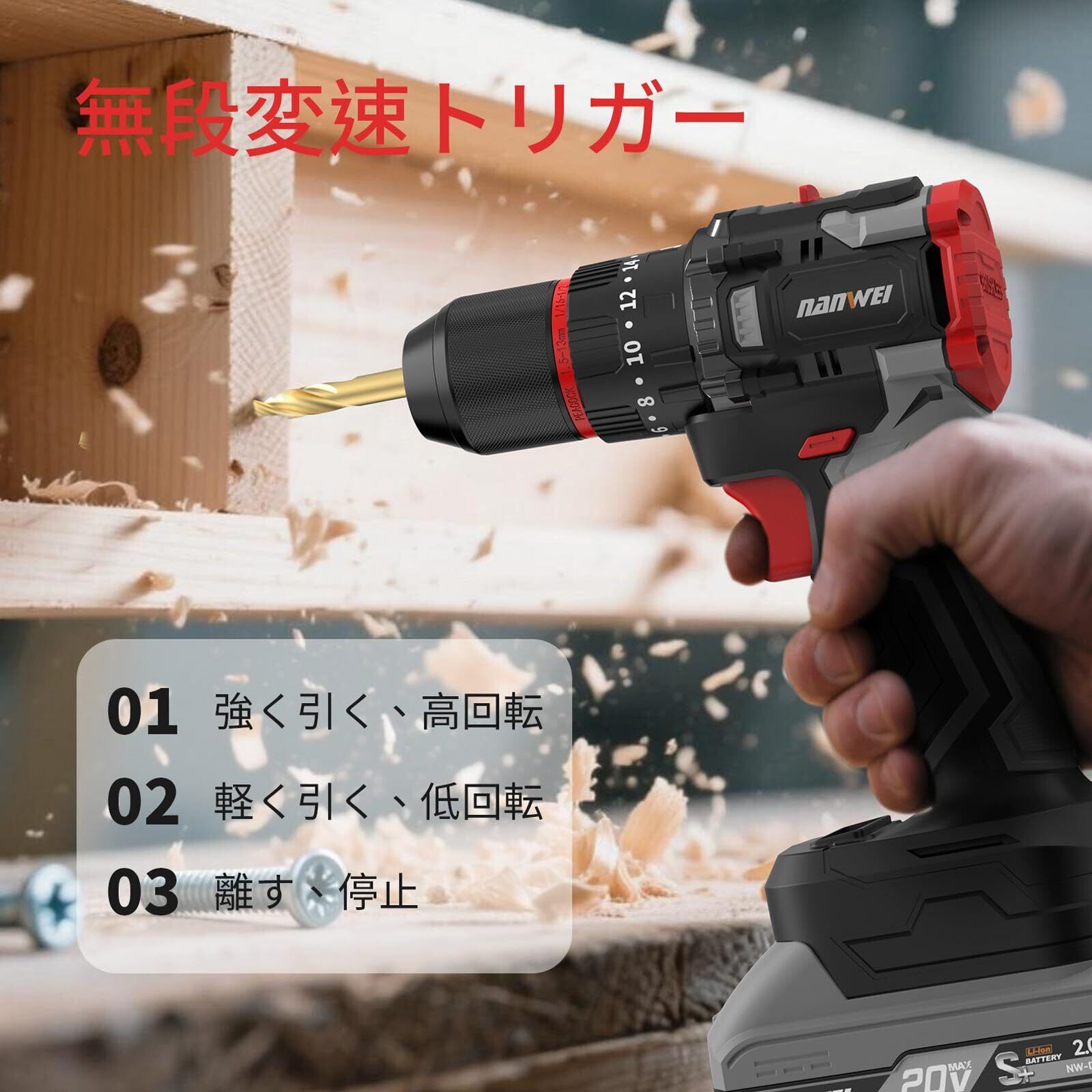 【20段階トルク調整&3モード切替で万能作業を実現】当社のドライバー 電動は、精密なトルク調整が可能な20段階クラッチを搭載。ネジの頭を潰さない繊細な作業から強力な締め付けまで、作業内容にぴったりのトルクを選択できます。さらに、ドライバーモード/ドリルモード/ハンマードリルモードの3モードをワンタッチで切替可能。DIYからプロの現場まで、木材加工からコンクリート穴あけまで、一台で幅広い作業に対応します。作業シーンに応じて最適な設定を簡単に選択できるため、作業効率と仕上がり品質を同時に向上させます。