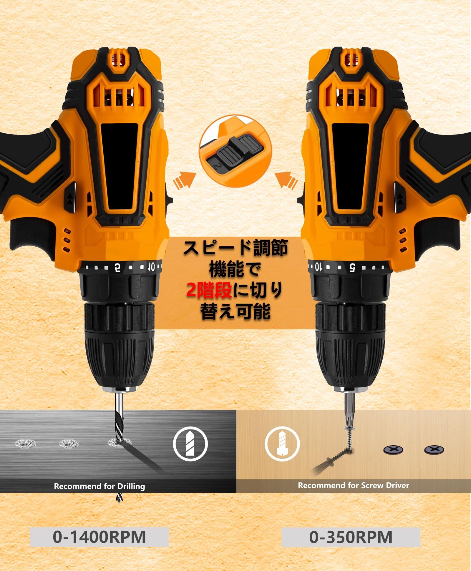【 25段階トルク調整 & 高/低速の切り替】:クラッチ機能で25段階のトルク調節可能、作業ニーズに合わせて自由に調節できます。 電動ドリルの回転スピードは2段階(0~350RPM/0~1400RPM)が切り替え、トリガーを握る力の強弱で無段階微調整が可能です。スピード調節とトルク調節機能で幅広い材質に傷をつけず、きれいな組み立てができる。