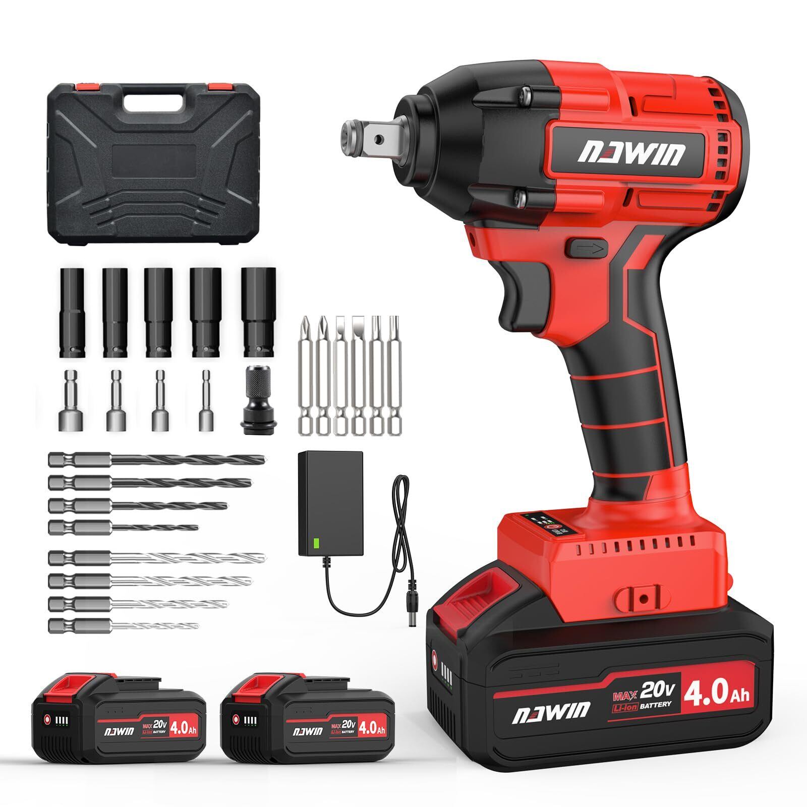 【人気商品】ナウィン 20V充電式インパクトレンチ 電動インパクトレンチ 最大トルク 320N・m コードレス ブラシレスモーター ボルトの締付・緩め ホイール交換 無段変速 高輝度LED照明 豊富な付属品 取扱説明書 収納ケース (2個電池)