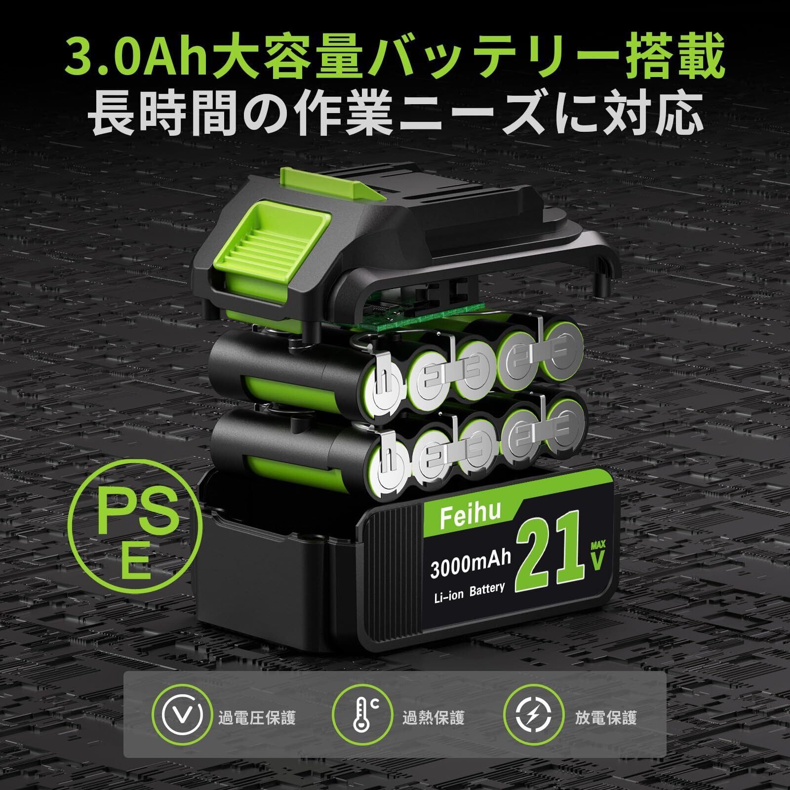 【18V・3000mAhバッテリー&長時間稼働】 3000mAh(3.0Ah)のリチウムイオンバッテリーを採用。1回の充電で長時間の作業が可能。急速充電器付きで効率的に連続作業。コードレス仕様により、屋外でも自由な動きをサポート。