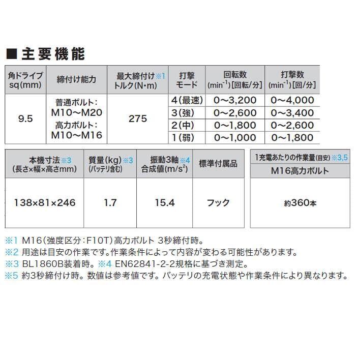 直流18V、スライド式Li-ionバッテリ仕様。バッテリ・充電器別売。角ドライブsq 9.5mm。締付け能力:普通ボルトM10~M20/高力ボルトM10~M16。最大締付けトルク:275(N・m)。回転数[回転/分]:最速 0~3,200/強 0~2,600/中 0~1,800/弱 0~1,000。打撃数[回/分]:最速 0~4,000/強 0~3,400/中 0~2,600/弱 0~1,800