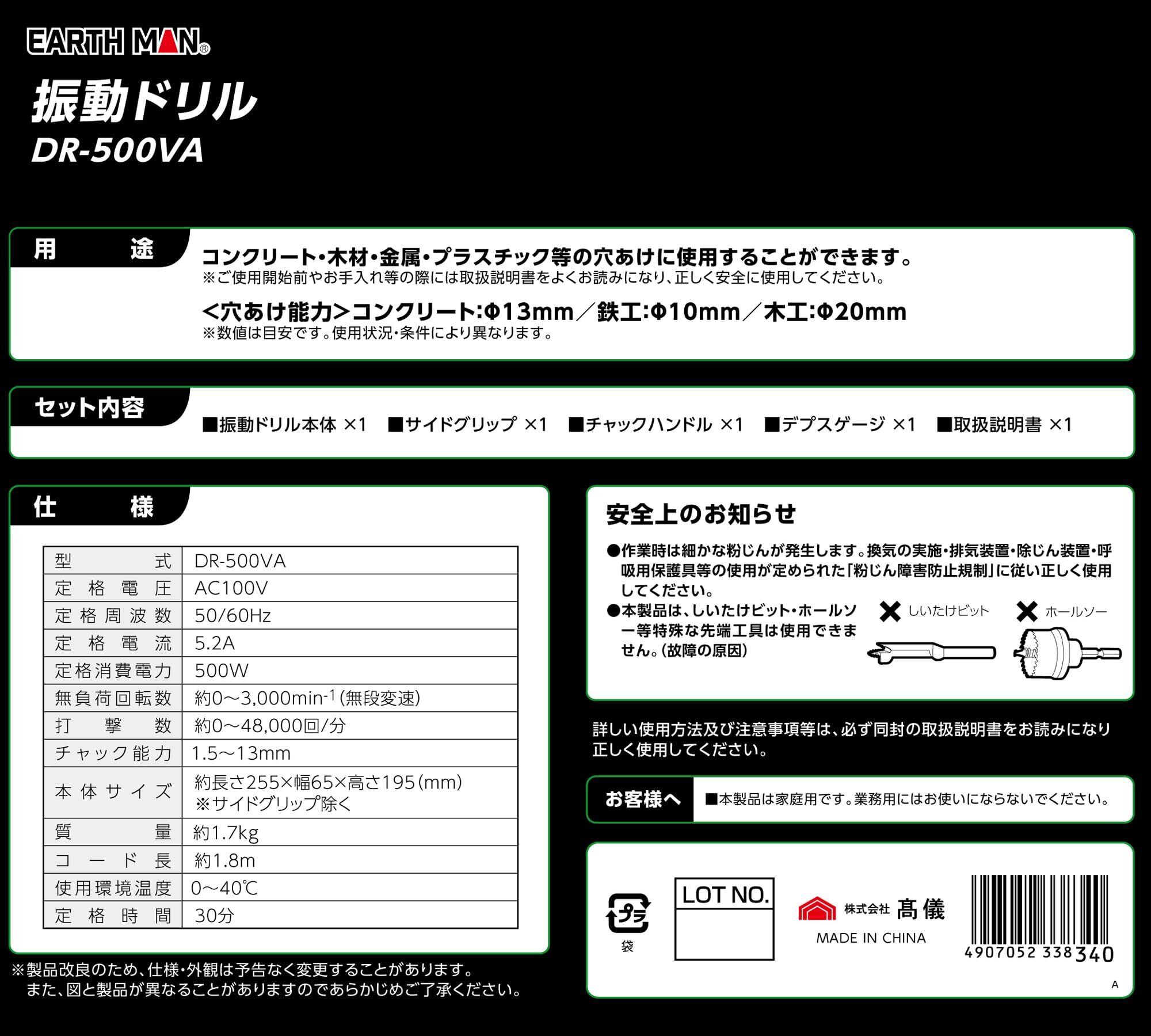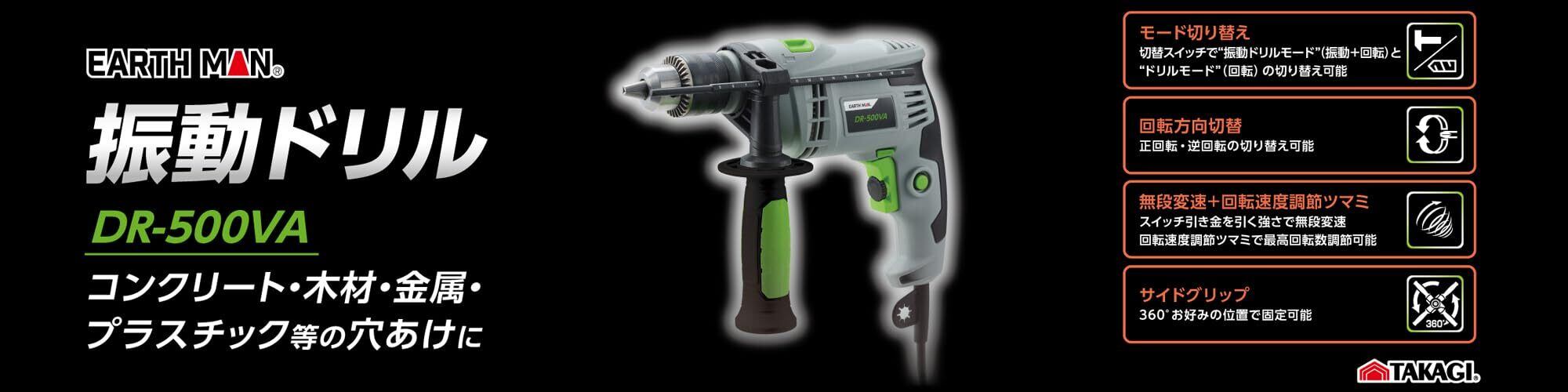 【特別価格】高儀(Takagi) EARTH MAN 振動ドリル アースマン AC100V 電動工具 無段変速 正逆切替 コンクリート 木材 プラスチック 穴あけ コード式 DR-500VA