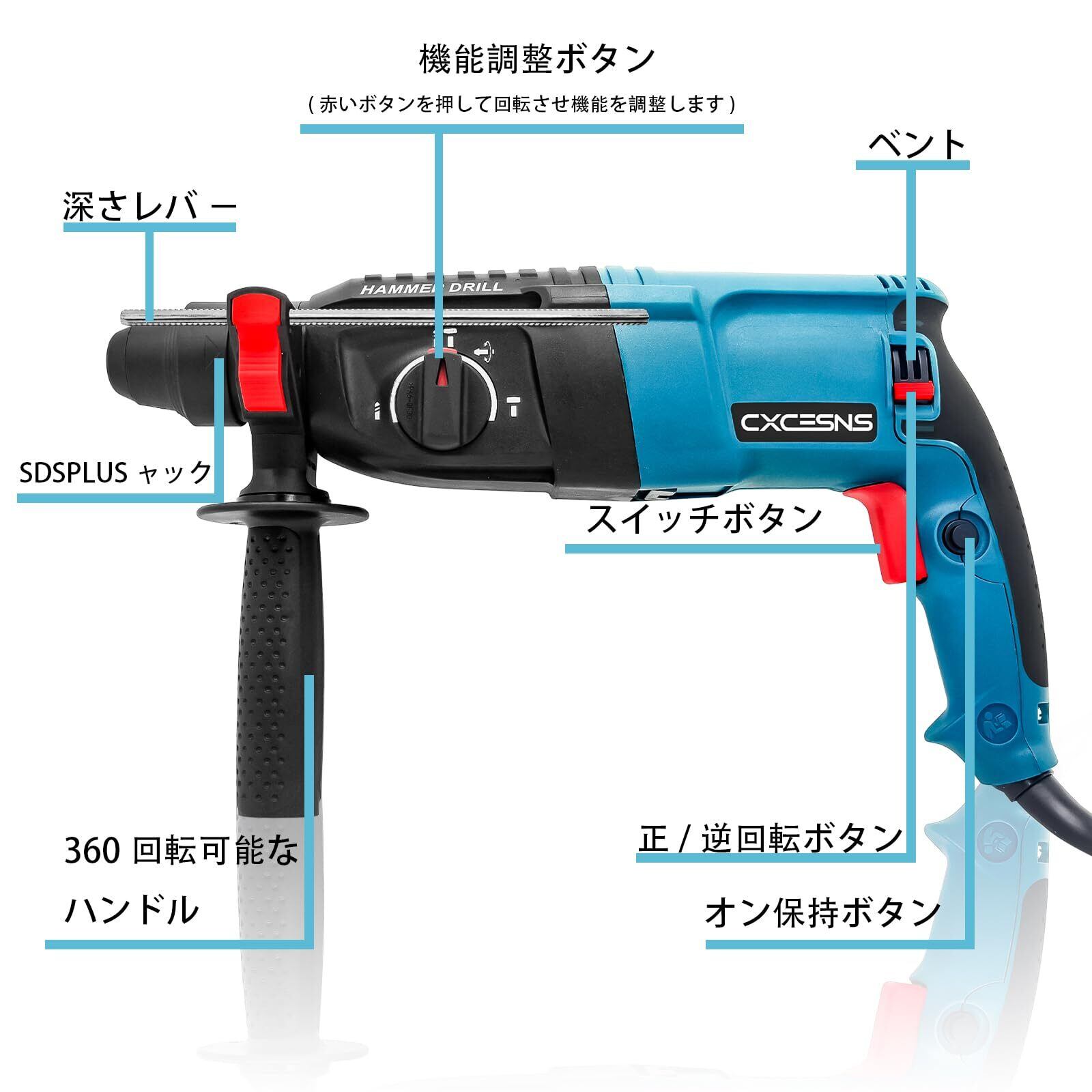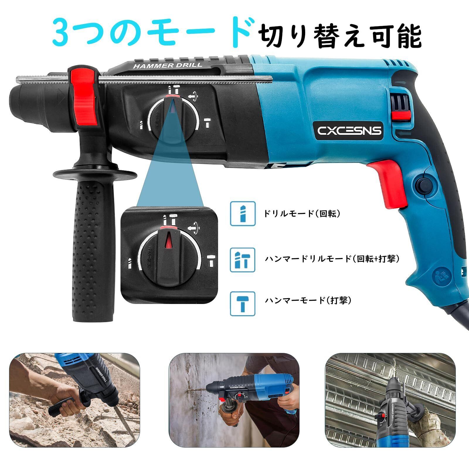 【数量限定】ハンマードリル 電動ハンマドリル 強力 110V コード式 低振動機構 無段階変速 3モード コンクリート26mm/鉄工13mm/木工30mm 電気ドリル 電気ハンマ SDSプラスビット5本 ドリルチャック1個 収納バッグ付き 日本語取扱説明書付き