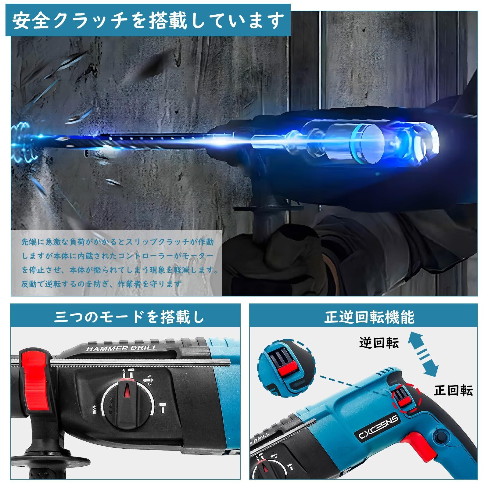 【知らせ】1.同梱で発送された先端工具をご利用の場合、ドリルチャックに差し込む必要なし、直接商品本体に取り付けてください。ドリルチャックに差し込んでから使える先端工具はお好みで別購入してください。2.私たちのハンマードリルは、"回転モード"だけで逆回転をサポートし。