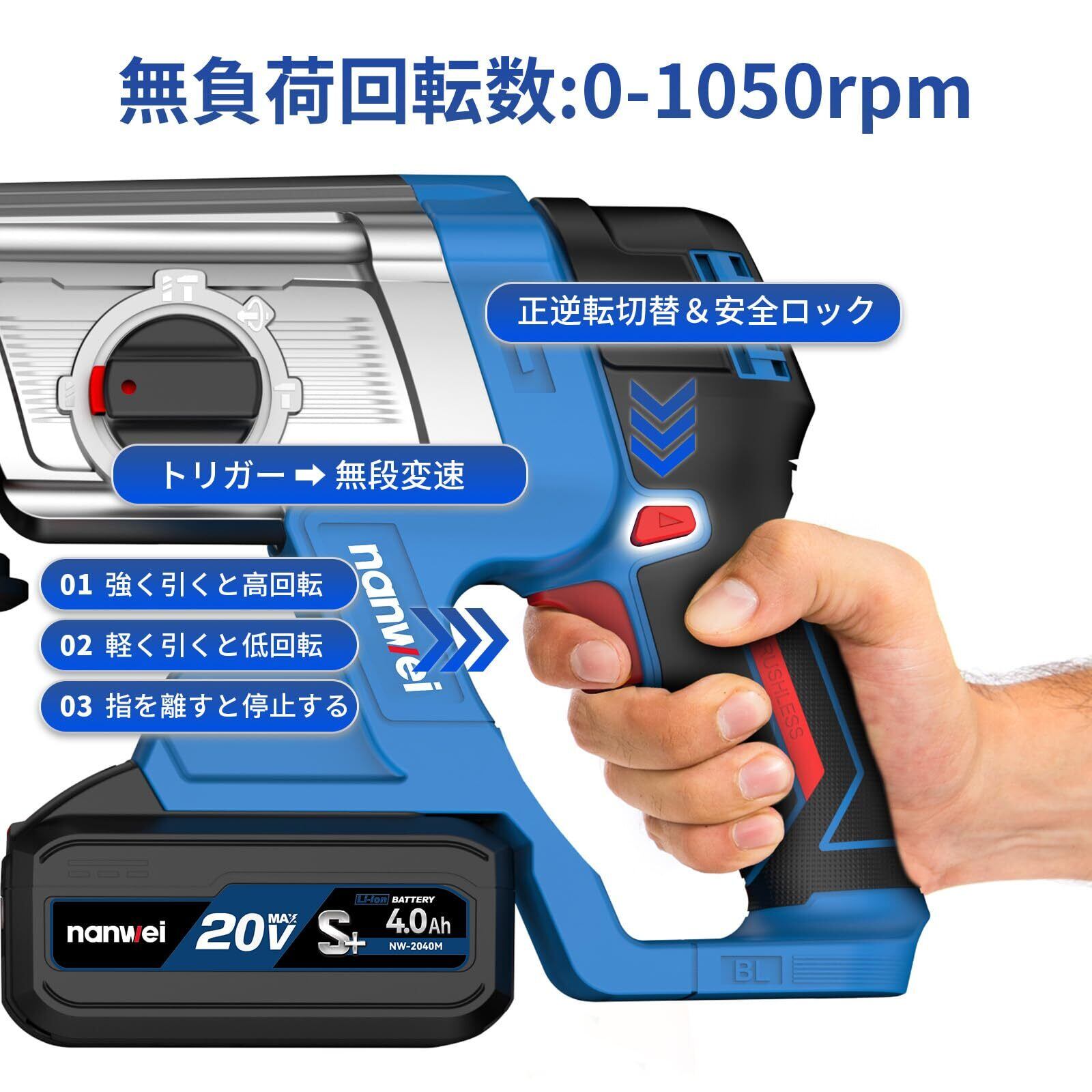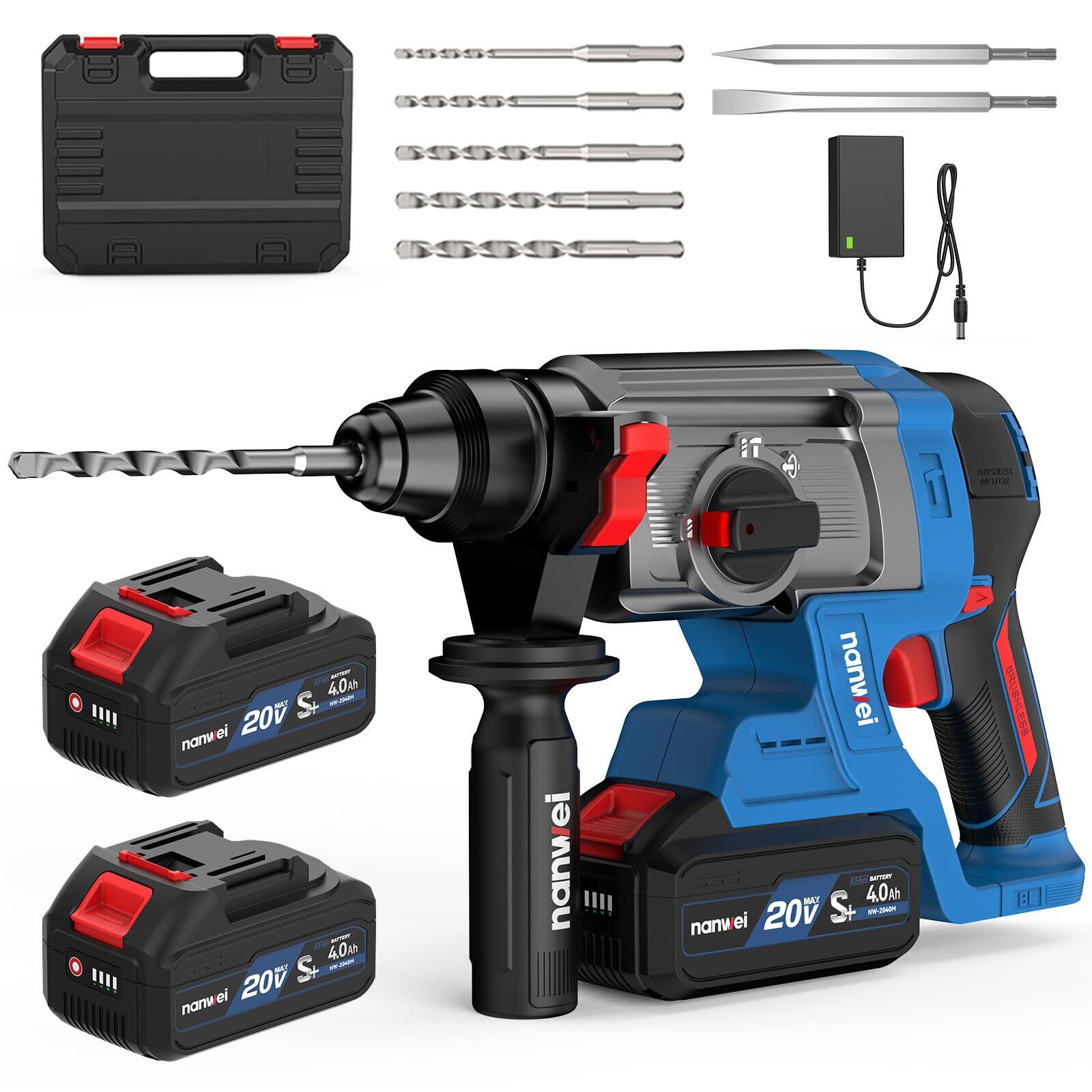 NANWEI 充電式ハンマードリル マキタ18Vバッテリー対応 コードレスハンマードリル 振動ドリル ブラシレスモーター SDS-PLUS 正逆転 無段変速 一台三役 4.0Ah電池2個付き 石材・壁・金属・木材の穴あけ ハツリ(斫り)工事