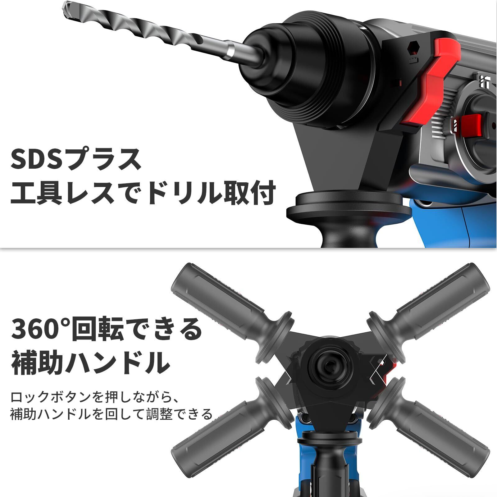 【安心のスマート安全システム】安全性にも徹底的にこだわり、SDS-Plusクイックチャックを採用し、ビットの着脱をわずか1秒で完了。工具の脱落を防ぐ自動ロック機構を内蔵しています。さらに、鉄筋検知機能を搭載し、コンクリート中の鉄筋に接触すると0.3秒以内に自動停止。これにより、ビットの折損や作業中の反動によるケガを防止します。また、360°回転可能な補助ハンドルを装備し、作業角度を自由に調整可能。グリップ部には防振ゴムを採用しており、長時間の作業でも手の疲れを軽減します。