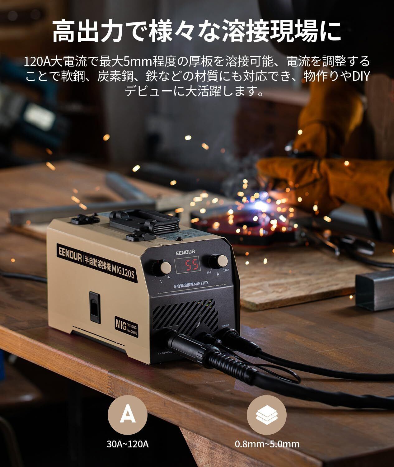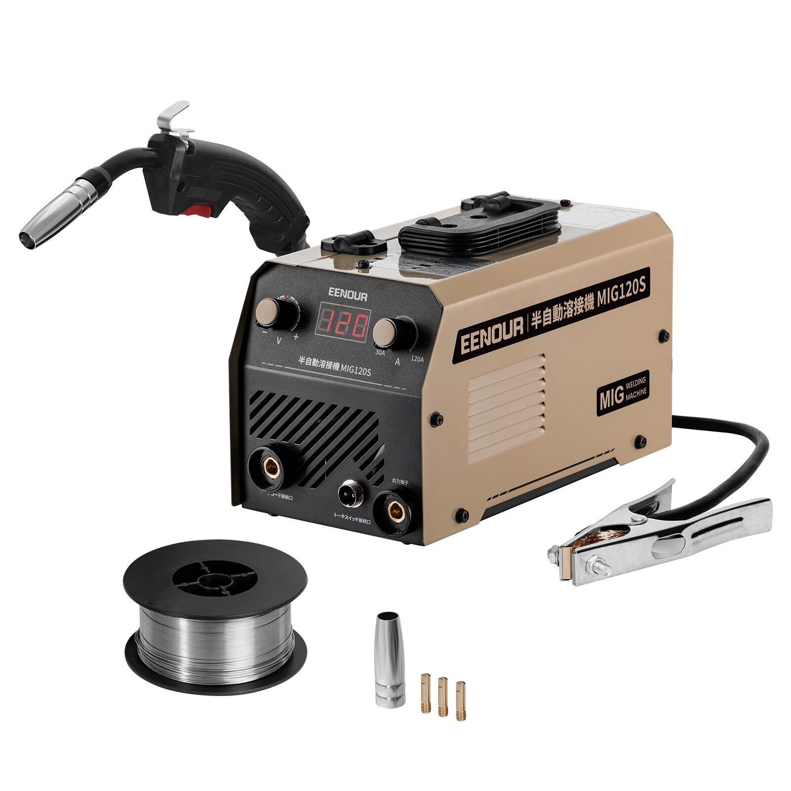 EENOUR 半自動溶接機 【日本溶接協会加入済】 MIG120S 最大出力120A ノンガスMIG溶接 液晶表示 インバーター搭載 スパッタ少ない 100V専用 ノンガス溶接機 電流·電圧調整可能 定格使用率30% 小型 軽量 家庭用 初心者向け 軟鋼、炭素鋼、鋳鉄等に対応 簡単な修理 家具・雑貨のDIYに大活躍