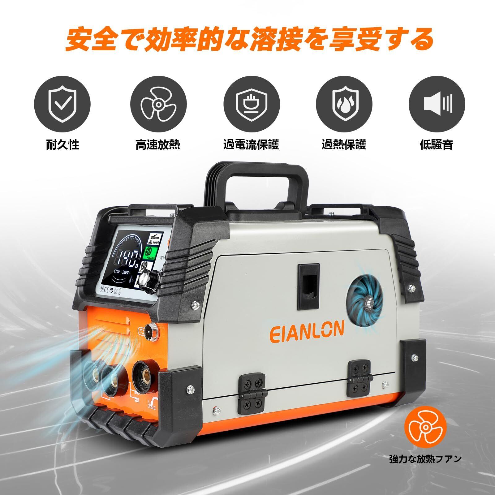 【100Vと200Vどちらでも使用可能】EIANLON 多機能溶接機は家庭用AC100Vおよび200Vの両方に対応し、電源に応じて自動的に切り替わります。定格出力電流:140A 適用フラックスワイヤー:φ0.8MM/φ1.0MM 溶接可能板厚:0.8-5.0mm。
