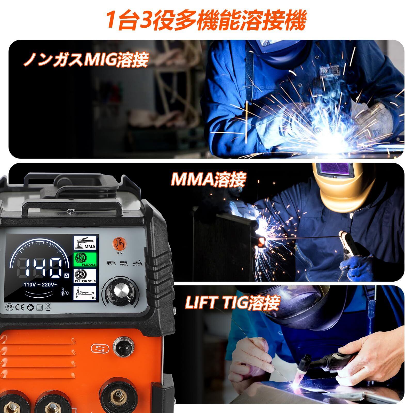 【人気商品】半自動溶接機140A 100V/200V兼用 ノンガスMIG/アーク溶接/lift TIG 1台3役 ノンガスミグ家庭用溶接機 小型 軽量 インバーター直流溶接機【日本語取扱説明書付き】MIG-140