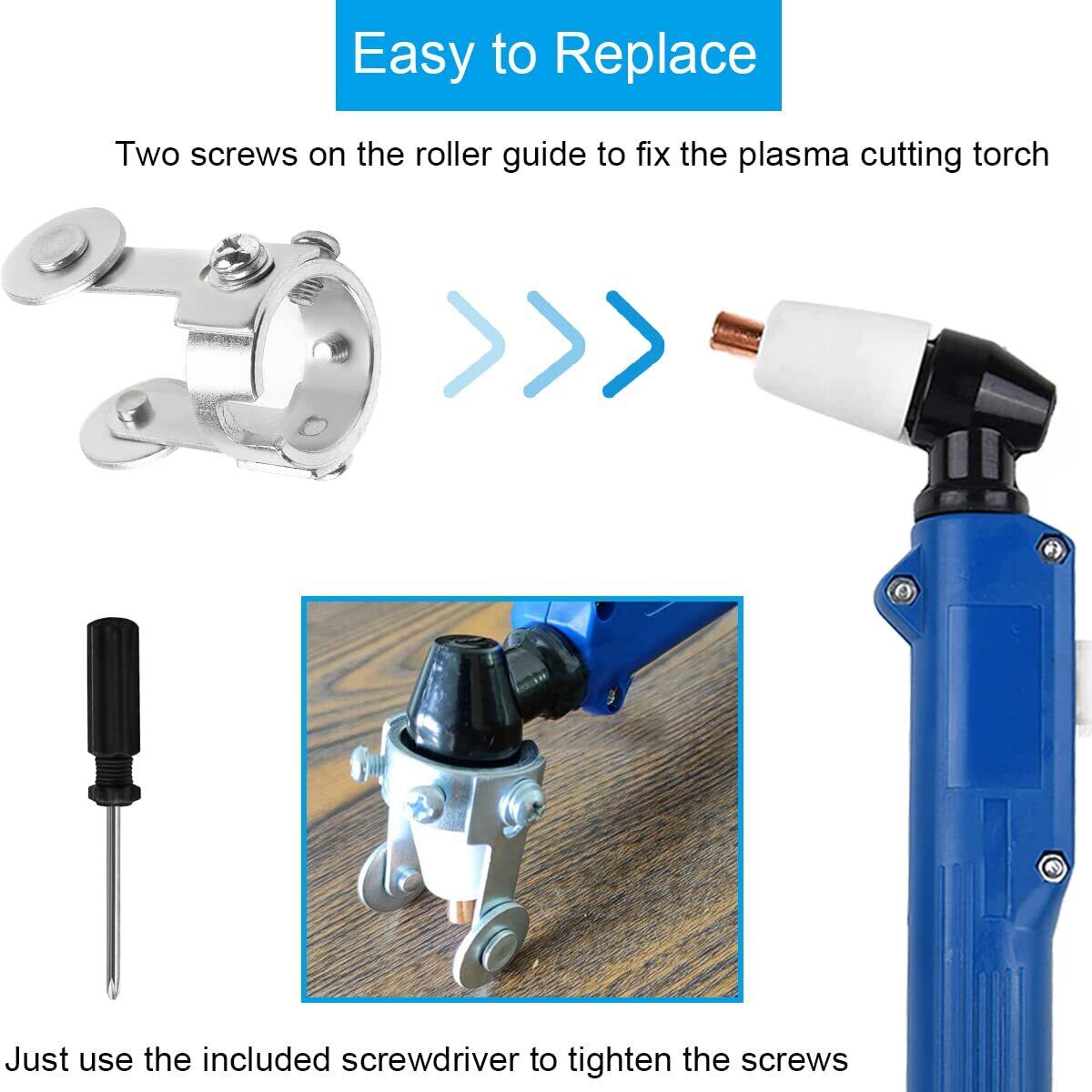 交換が簡単: ローラーガイドにはプラズマ切断トーチを固定するネジが2本あり、交換が非常に簡単です。