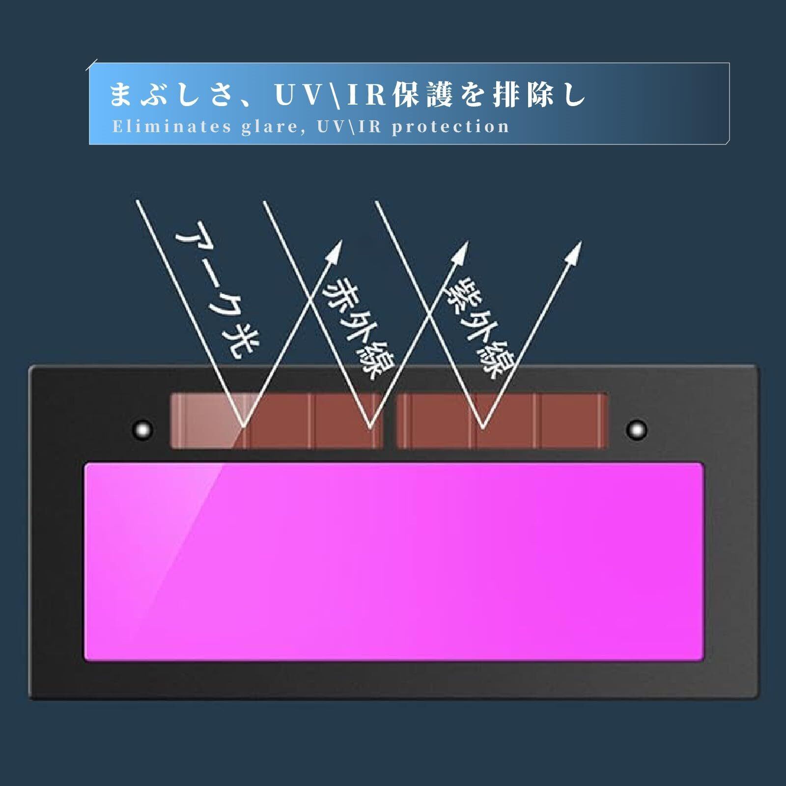 【 広い視野 】:自動暗化レンズは高解像度ビューがあり、溶接状態で自動的に悪い光を遮断し、フィルタリングし、視覚疲労を低減し、目を保護し、職業病を防ぐことができます。※撮影、光、表示、モニターにより若干の色味の違いがみられる場合があります。