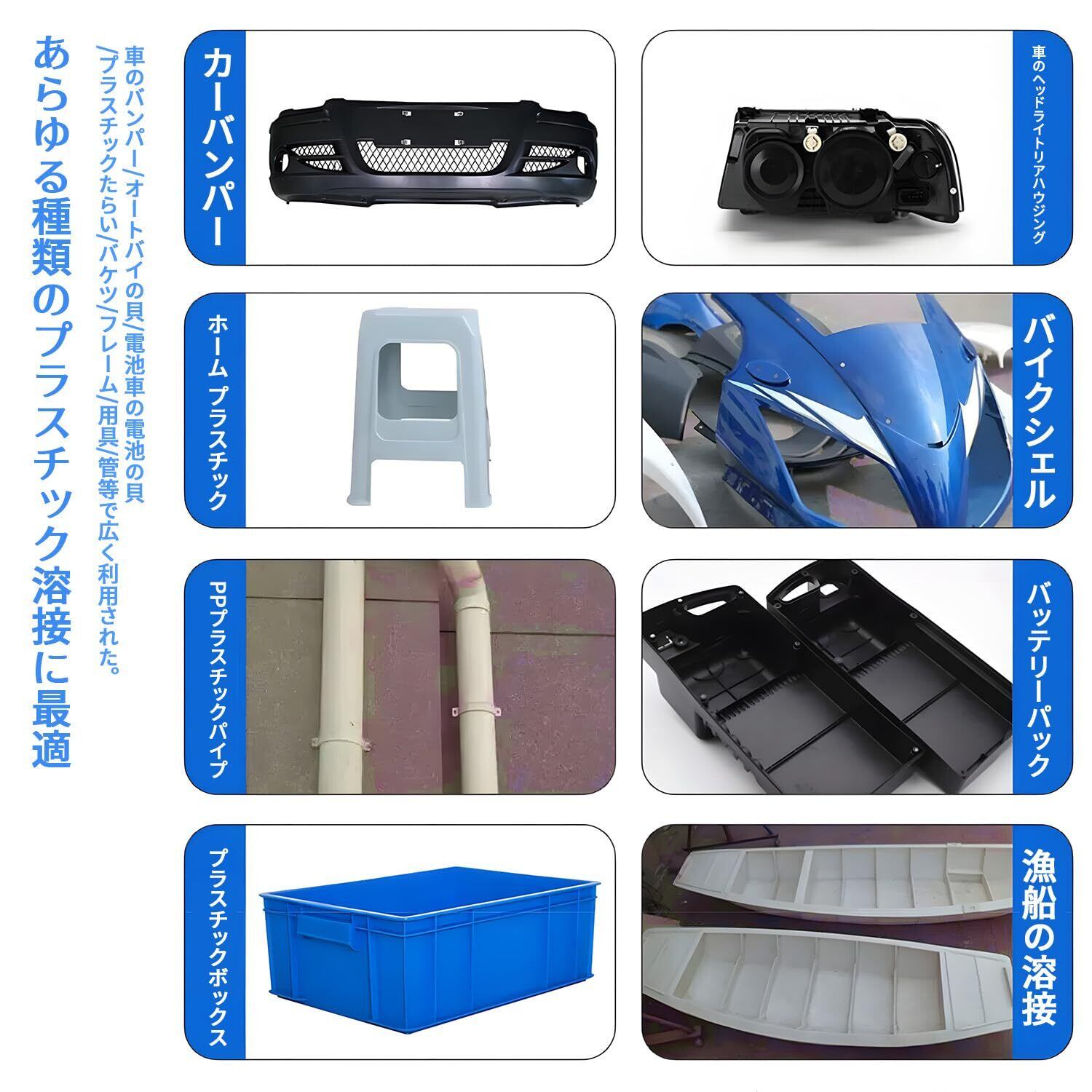 【多分野で活躍】自動車:バンパー、内装パネル、ラジエータータンク 、家庭:PVC配管、家具金具、家電ハウジング 、DIY:模型制作、農業資材、水槽補修 あらゆるプラスチック製品の破損やヒビ割れに対応し、修理後の見た目もきれいに仕上がります。