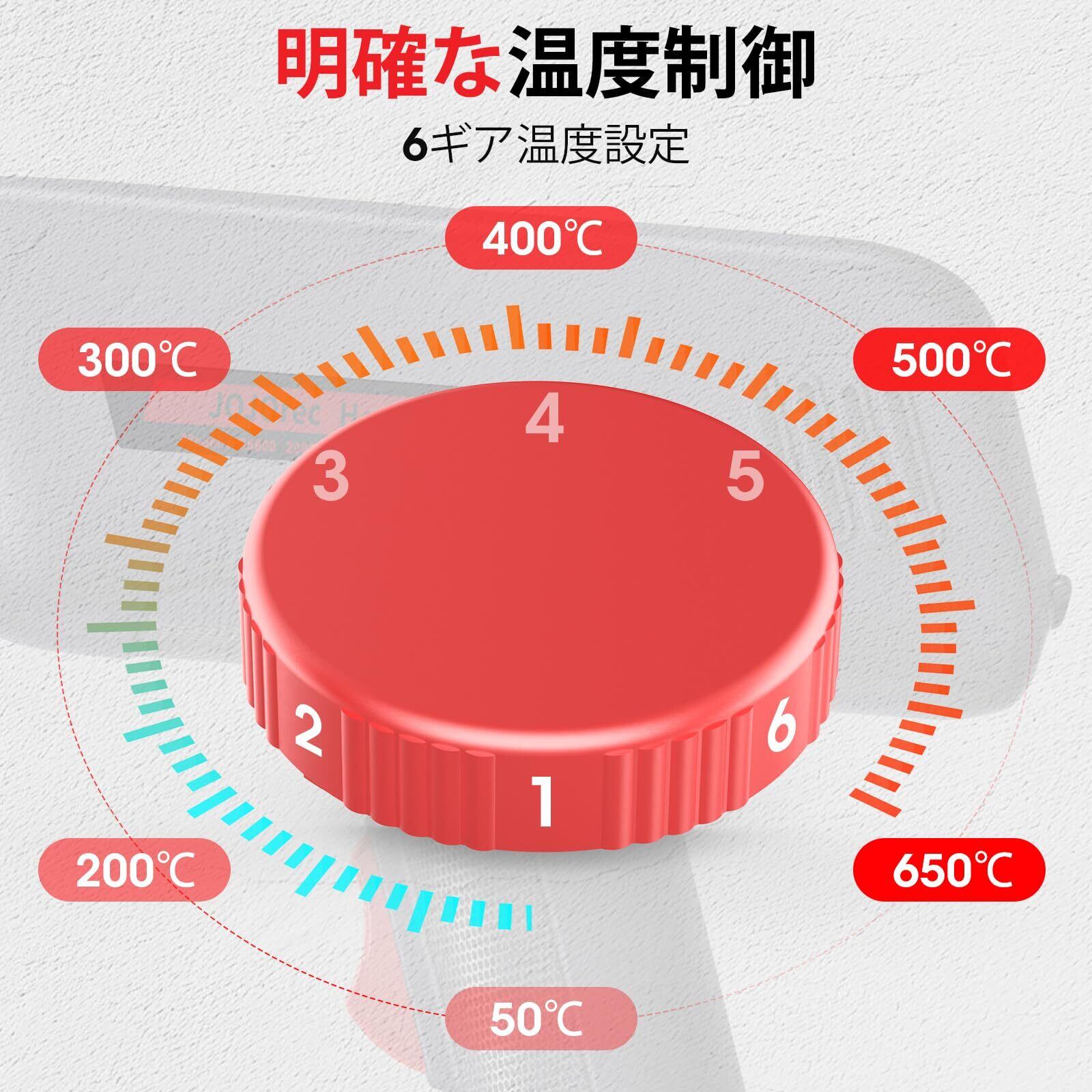 2025年新登場 無段階調温 ヒートガン ホットガン 2段階風量 6可変 温度 設定 ヒートがん AC110V 1400W 50℃~650度 過負荷保護機能 多用途熱工具ヒートガン 6種類の異なる部品 スクレーパー1本付き 工業用ドライヤー 二重絶縁 日本語取扱説明書 PSE 認証