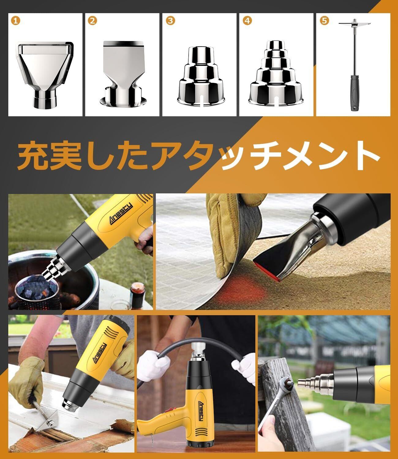 【人気商品】Anesty HG-01Y ヒートガン 無段階調温可 ひーとがん 2段階風量 50~600度 多用途ヒートガン ノズル4種類 三角スクレーパー1本 PSE認証