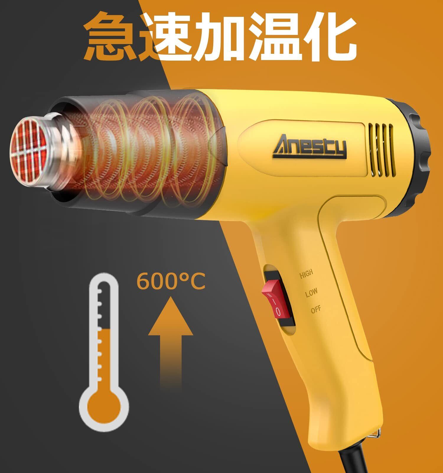 Anesty HG-01Y ヒートガン 無段階調温可 ひーとがん 2段階風量 50~600度 多用途ヒートガン ノズル4種類 三角スクレーパー1本 PSE認証
