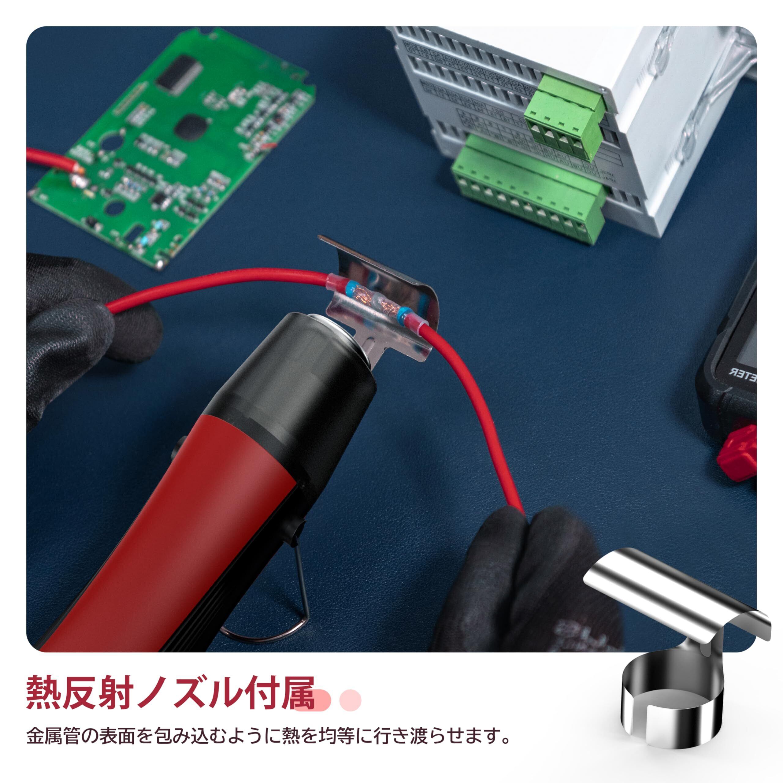 【便利なデザイン】折りたたみ式スタンドが熱風機本体に付属しており、横置きの状態に両手を使って作業可能です。フックのようなノズルは全方位から熱を加えることが出来、熱収縮チューブやプラスチック棒を温めて曲げたりするような熱処理加工作業のに適用。