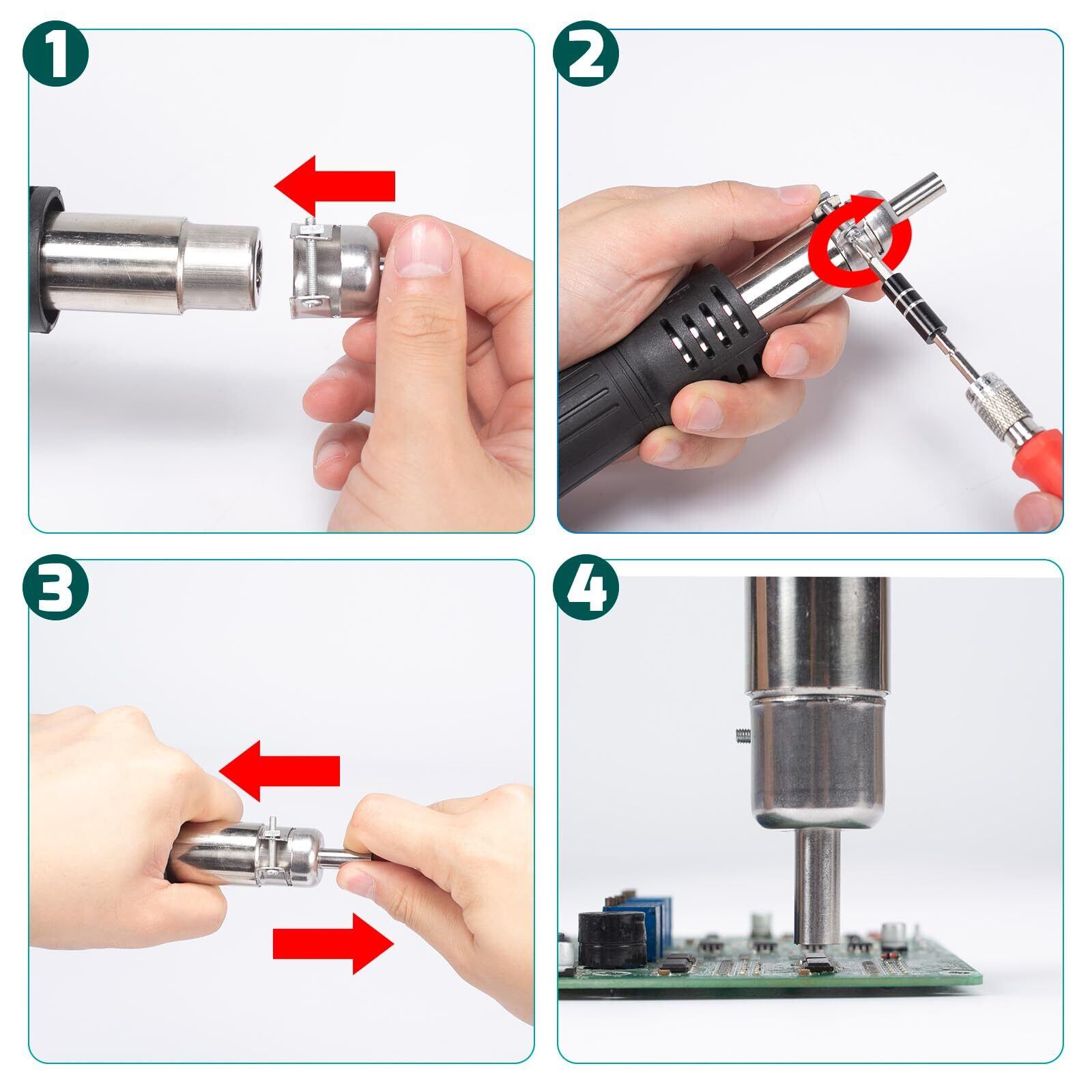 「使いやすいセット」8858-Vは、適応性、精度、安全性を兼ね備えた多用途のはんだ付けキットです。曲げピンセットとストレートピンセット、3種類のノズル、幅広い作業に対応できます。安定した温度制御のためのPIDプログラム、℉/℃変換、正確な制御のためのデジタル温度キャリブレーション、熱風フェールセーフなどの安全機能など、インテリジェントな機能を搭載しています。