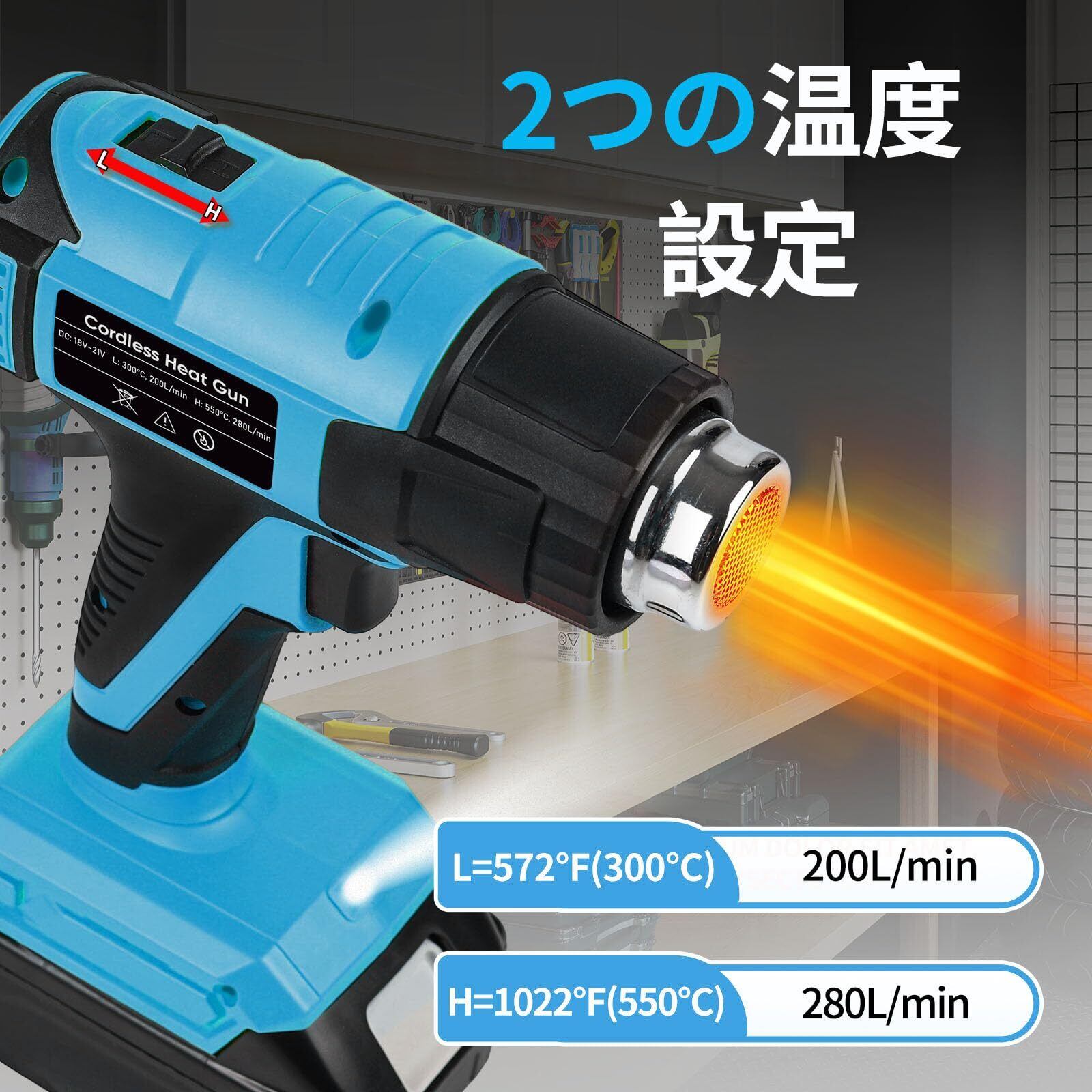 【二重温度・風速設定&急速加熱】このコードレスヒートガンは二重温度・風速設定を搭載:低温モード:300℃、200L/min、熱量要求の低い精密作業シーンに適応;高温モード:550℃、280L/min、高熱量・強風力による効率的な作業要求を満たします。本ヒートガンは高品質セラミックヒーターコアを採用し、急速昇温と優れた耐久性を両立しています。作業ニーズに応じて適合するモードを選択でき、様々な作業条件に柔軟に対応できます。※本セットには電池は含まれません。