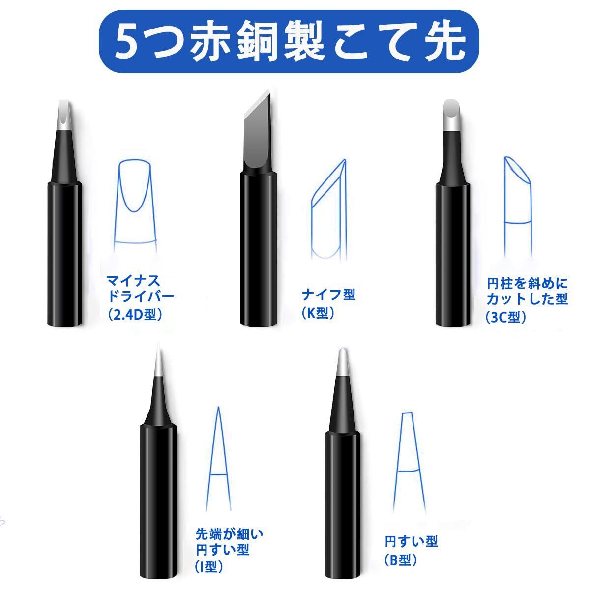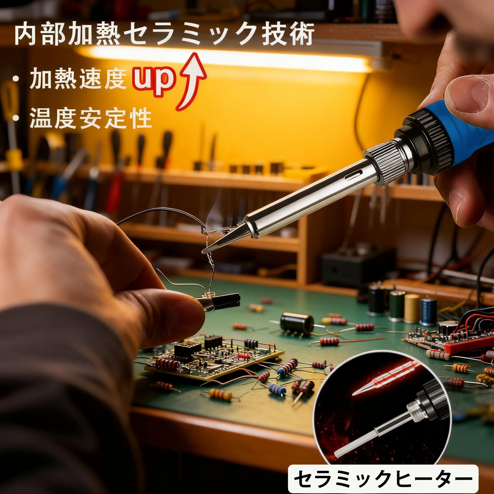 1【充実なセット・一個あれば十分】14点セット内容:はんだごて本体×1、高純度はんだ×1、はんだごて台×1、はんだ吸取器×1、はんだ吸取線×1、無酸素銅こて先×5、帯電防止ピン×2、清潔スポンジ×1、日本語取扱説明書×1。電子工作に必要な付属品が全部揃いており、プロジェクトを効率的に完成させるのに役立ちます。別に購入する必要はありません。時間とお金を節約!