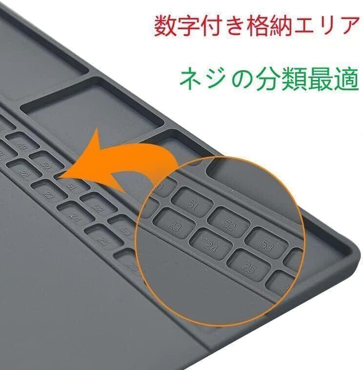 【効率性の向上】両面滑り止めの設計があります。作業の時に勝手に移動することは発生しないです。解体工具やネジなどの小型パーツが失われにくいように、作業マットの上部には6x6mmの格子98個、15x25mmの格子16個、32x124mmの格子1個を設置しています。小さな部品の仕分けを容易にし、効率を向上させました。