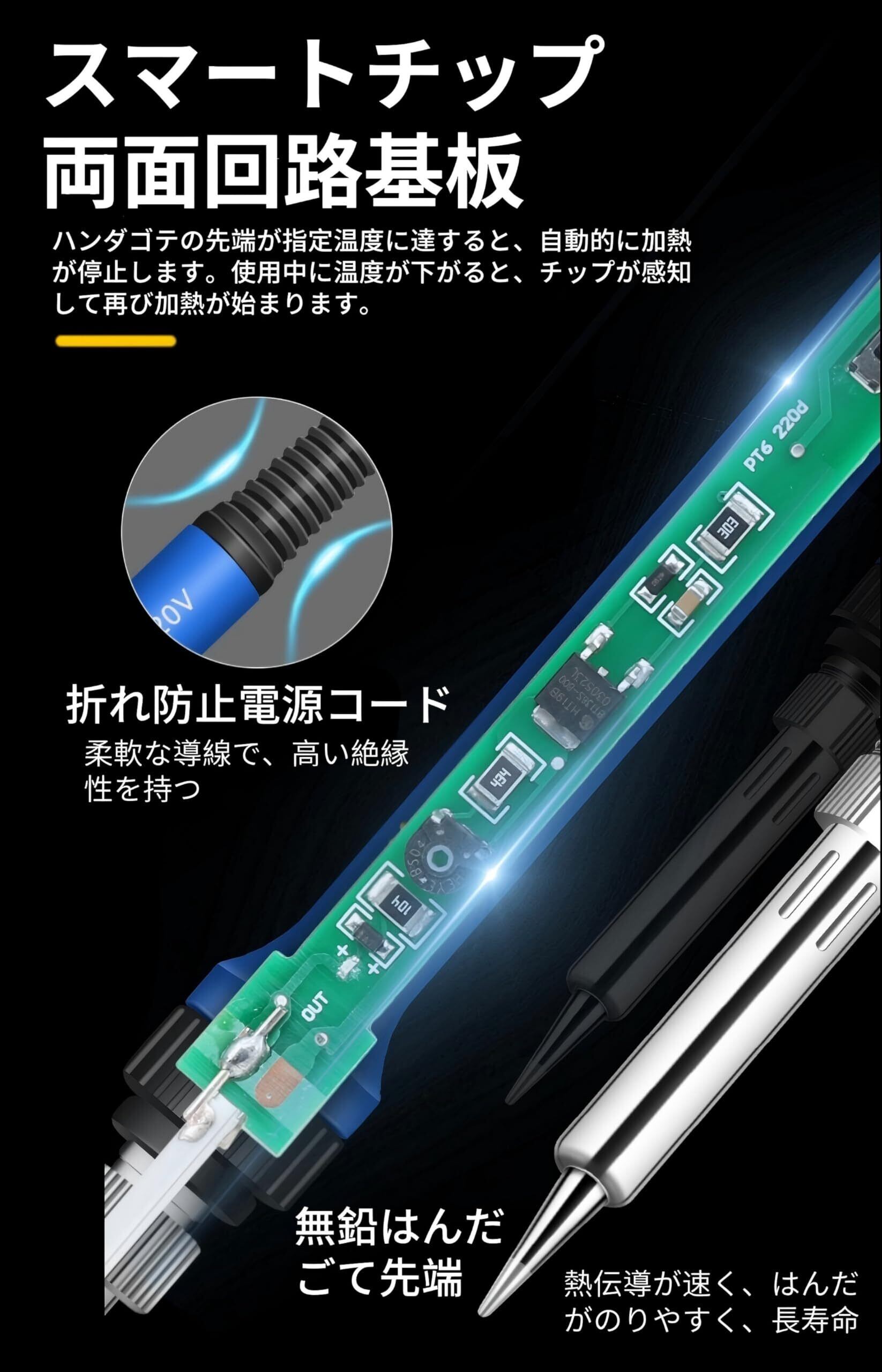 初心者から上級者まで安心して使えるはんだごてです。 100Wの高出力により、200℃~480℃の広範囲な温度調節が可能。電源ボタン付きで安全性も抜群。コード式の設計で、安定した電力供給と急速加熱を実現します。スマホ・パソコン・基板修理や電子工作、ホビー用途など幅広い場面で活躍。