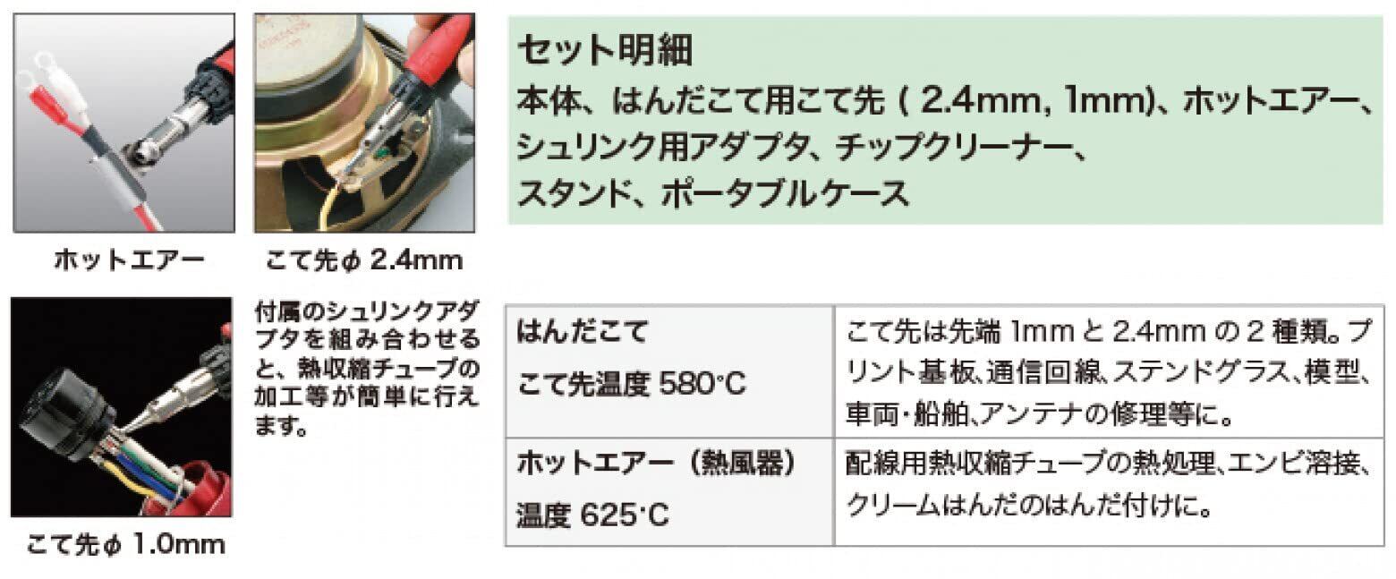本体、はんだごて用こて先(2.4mm、1㎜)、ホットエアー用ノズル、シュリンク用アダプタ、チップクリーナー、スタンド、ポータブルケース