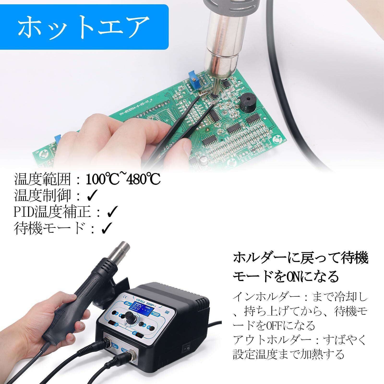 YIHUA 938BD+I はんだこて ホットエア 2 in 1 リワークステーション 温度制御型 温度安定(PID温度補正) アジャストモード 待機モード スリープモード
