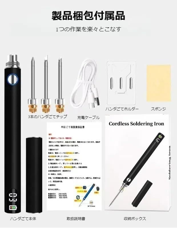 デジタル表示 充電式 半田ごて ペン型半田ごて 三段階 温度調節可(200℃-450℃)自動加熱モード ワイヤレス ハンダゴテ はんだ ごて 充電ケーブル付き 日本語取説付き (軽量-デジタル表示)