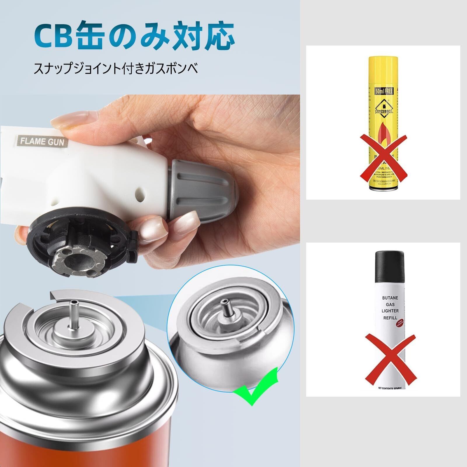 【操作簡単&安全】電子点火を採用し、操作がとても簡単で安全で、市販のガスボンベに装着するだけ(CB缶対応)、非常にアウトドアやキャンプに適しています。安全ロックを搭載して、ガス漏れによる火災を防 ぐことができます。(ガスボンベは別売り)。ご注意:CB缶対応のみ、他のガスボンベはガス漏れを引き起こす可能性があります。製品を落下や水没を避けてください。漏れを発見した場合は、直ちに製品の使用を中止し、にご連絡の上、問題を解決してください。