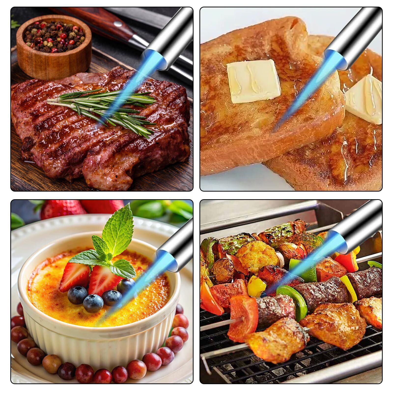 【幅広い用途】このトーチは、キッチンでの使用に最適で、ステーキ表面の素早い炙り、クレームブリュレのキャラメリゼ、オーブンや炭火の着火などに活躍します。さらに、キャンプなどのアウトドアでも重要な役割を果たし、焚き火の点火、湯沸かし、食材の加熱などに利用できます。コンパクトで操作が簡単、炎は安定して高温を保ち、多様な調理や加熱のニーズに応えます。また、簡単な溶接やPVCパイプの曲げ加工などにも使用可能です。